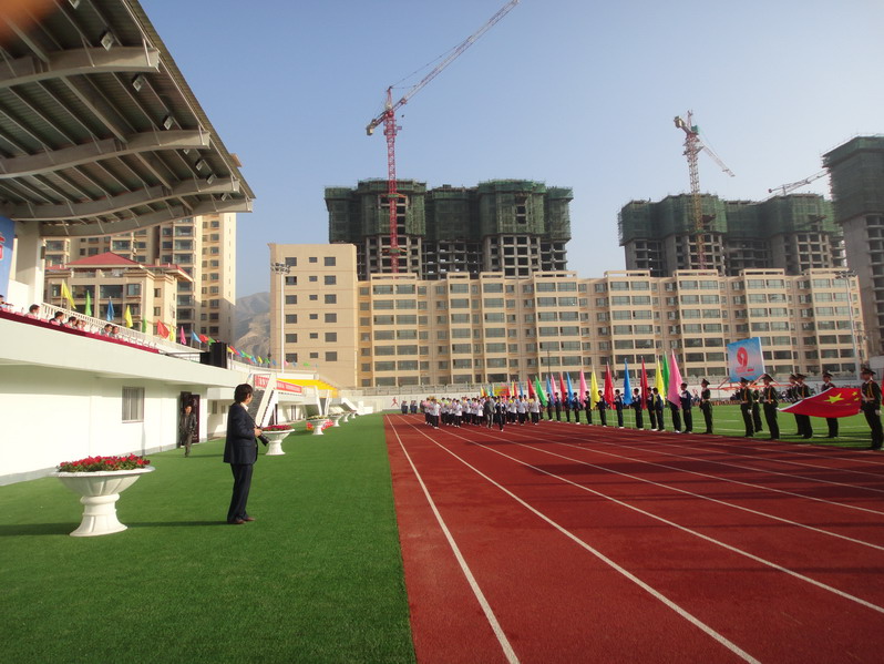 新落成的操场是那么美,走在上面软软的,又不乏坚实的感觉。同学们都坐在一起,情趣盎然地欣赏着各类节目,还没有上台表演的同学也静静地坐在操场上,饶有兴趣地观看着节目。