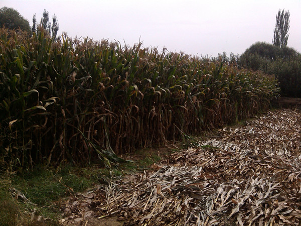 来到田野,一排又一排玉米杆就像军人一样驻守田野,硕大的玉米插在玉米杆上形成一个"y"字型,瞧,那壮实的玉米,把肚皮都撑破了,就等着农民伯伯收他们回家呢!