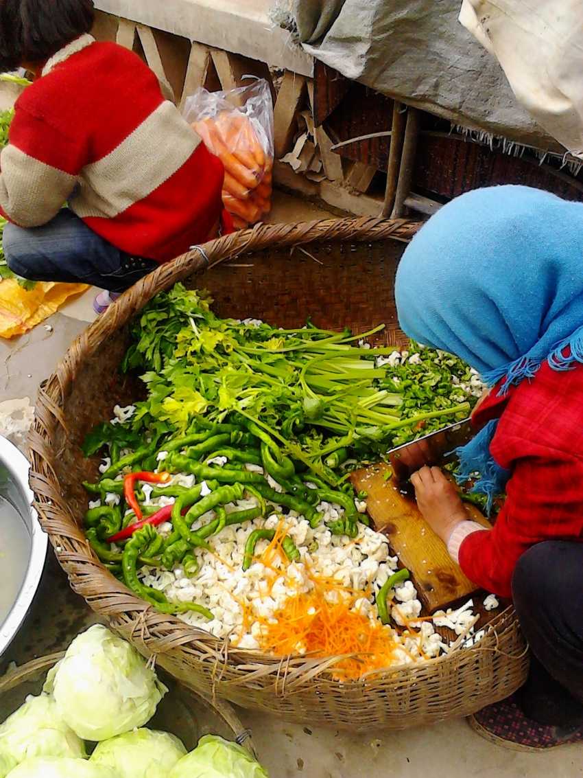 刚出锅的菜还需要在冷水里浸泡一会儿,便可以放到菜板上切了。看吧,五颜六色的蔬菜看得人眼花缭乱,让人情不自禁的流口水。在仔细一看,奶奶和妈妈的娴熟的刀工,更让人心生敬畏,只可惜我不会。这就是在农村人们口中所说的“熟菜”。