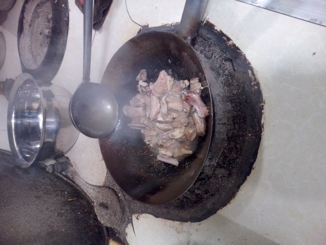 下锅 将半勺植物油热成八分,直接将准备好的鲜肋骨放入油锅中,反复翻搅(注意不要烧焦)。等到血水干了加入适量蒜片,再加点生姜水,继续搅拌并依次放入基本的调味品和鸡汁。快熟的时候放入辣块和葱段,最后在滴几滴花椒油就可以了。