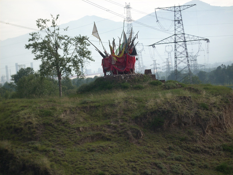 幸福美满的生活总缺不了一些疾病,除了打针吃药,家长会领着孩子怀着一颗虔诚的心到"山佛爷"那去了祈福,求他保佑家人平安。所谓"山神爷"就是用布围成缺口的四边形,插满了旗子,里面摆上供品,点着蜡烛。地点往往在小山坡上一棵大树旁边,风水好吗!在我的家乡,这就是不可侵犯的神的形象。