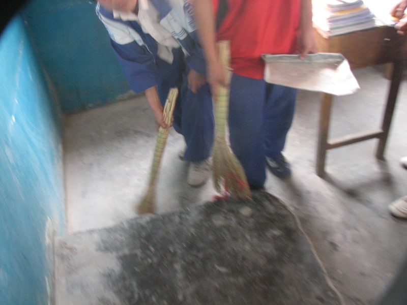 我们早已分好了组,打扫宿舍卫生的是住宿生,一个宿舍住八个人,但只留四个人打扫,他们负责整理床,打扫卫生,擦玻璃等,女生宿舍也是如此。教室打扫卫生的共一小组14人,他们负责打扫教室卫生,刷黑板,擦玻璃,擦灯管,还有一部分学生被分去打扫环境卫生了。各班有各班的卫生区域,一幅热闹的场面。
