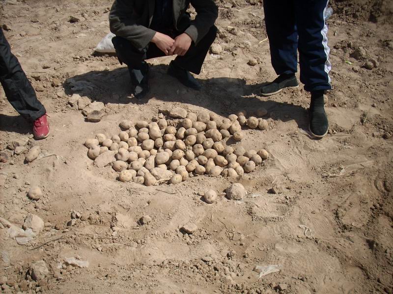 当炉子烧好后,便可以将土豆放在里面。值的注意的是,土豆要放到火灰上,然后从顶部开始将一块块炽热的拍进灰坑里,让它们和土豆充分接触,这样有利于热的传递,让土豆尽快熟透。把土块拍碎后再在上面覆一层沙土,包裹严实便完事了。几个小时后,香喷喷的烧土豆便出炉了。