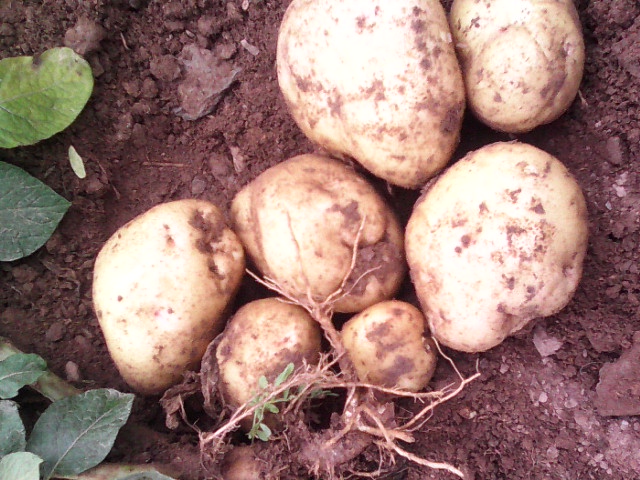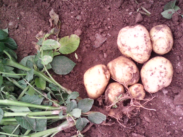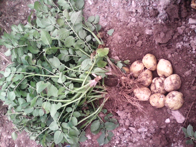 一到秋收时,满山遍野都是洋芋地,它的秧跟西红柿的秧相似,不过它不用打架,而是一小堆一小堆的,成熟时,把土堆铲开来,就会出现圆溜溜的,大小不一的,有的像大人拳头大,有的像小孩拳头大的洋芋。它的外皮有点粗,但是越粗越好吃,不过消掉皮以后,就会呈现黄橙橙的果肉来。