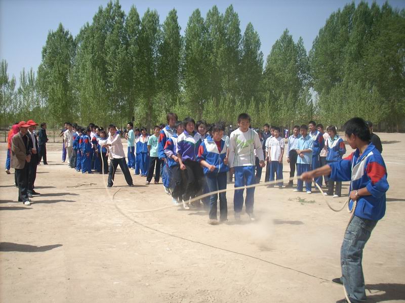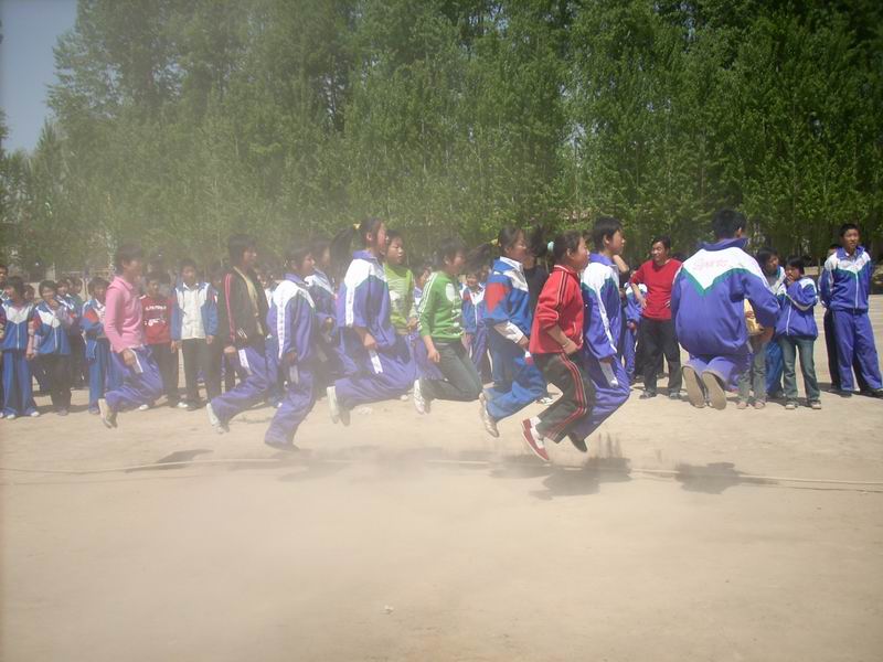 每年我们学校都要举行五一田径运动会,目的是为锻炼同学们健康的体魄,让我们以昂扬的精神面貌投入到学习生活中去。我们的比赛项目有:跳远、投掷铅球、接力赛跑等一系列比赛项目,同学们 都热情参加,度过了一个个美好的五月。不过,今年,可不同了。学校为增加运动会的趣味性,还增加了一个新的娱乐项目,那就是——集体跳绳。