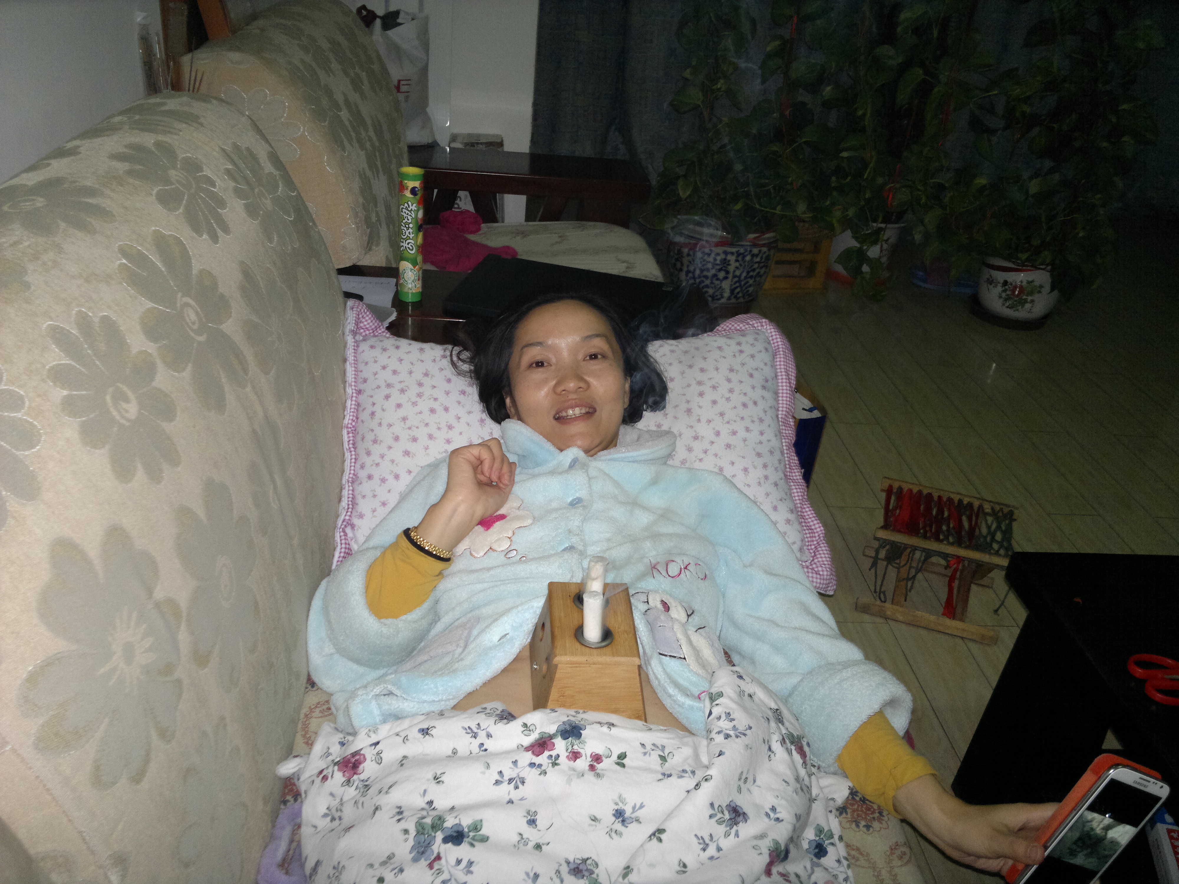 这是我的妈妈,家里的大部分开支都由她那瘦弱的肩膀来承担,因为长时间在阴冷的隧道里工作,使她换上了许多这个年龄不改患的病:鼻炎、骨关节炎。最近病又加重了,只有靠"熏艾"这种办法来暂时祛除寒气,缓解疼痛。