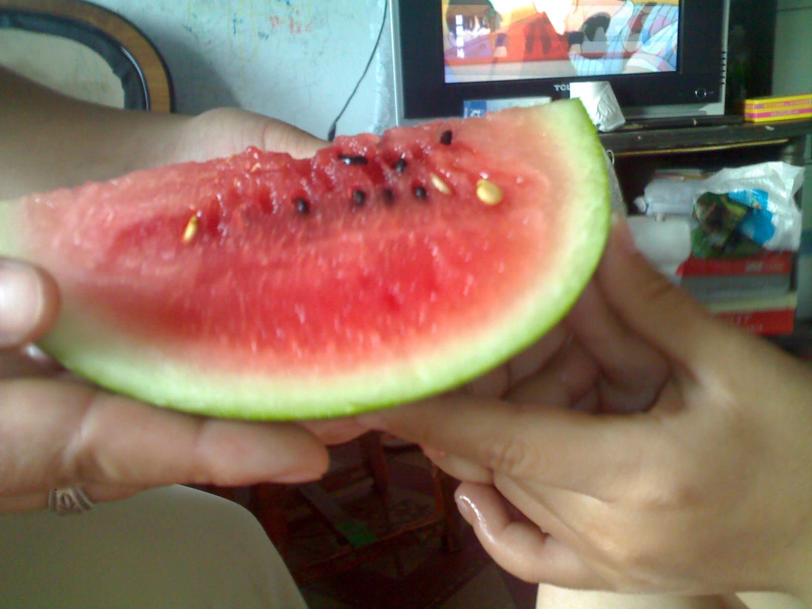 就这样,我们抱着一个大西瓜回到了家.一进屋,我便迫不及待地来到厨房开始洗西瓜.洗干净后,我又用水果刀切起了西瓜.只见西瓜脆脆的外衣里有一层薄的白色,再使劲一切,哇,鲜红的汁流了出来.一颗颗黑油油的西瓜籽镶嵌在红红的瓤中,看着就很美味.我和姐姐争先恐后地抢着吃西瓜.一口咬下,甜甜的,凉凉的,于是我大口大口地吃了起来,连满脸都是西瓜汁都顾不了了.就这样,一大盘西瓜不一会儿就被我们消灭的只剩两块了.看着它们,我心想,是不是应该给爸爸妈妈留一些,他们已经在外劳累一天了,一定很渴吧.而且老师也常常告诉我们要孝敬父母,不能光想着自己.