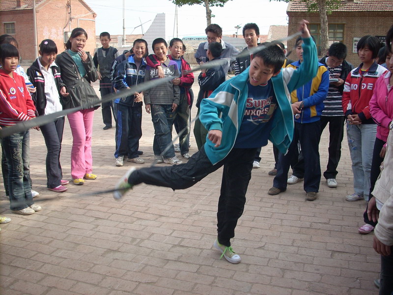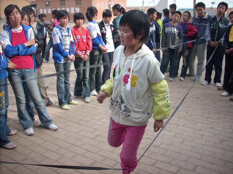 跳的时候,绊了一下,导致只跳了三十多个,他们回来后,认真看其他班跳,发现得了第三,很是意外,男生比完了,就该每个班的女生了,看着第一个班跳,心不免有些紧张,怦怦地跳了起来,轮到第二个班跳了,我们女生聚在一起,讨论"战略"。很快,该我们班了,我们女生共跳了四十下,最后,得到了第三。