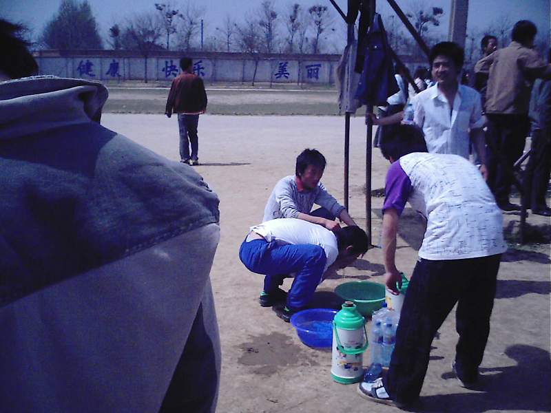 半场结束了,双方队员下阵休息,服务的同学早已经将水盆放在一边了,各个队员洗把脸后,喝瓶矿泉水,说说刚才的失误以及下面的人员变更,都鼓足气力说,一定要赢过对方……