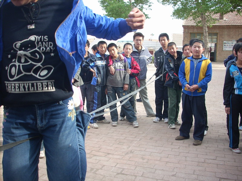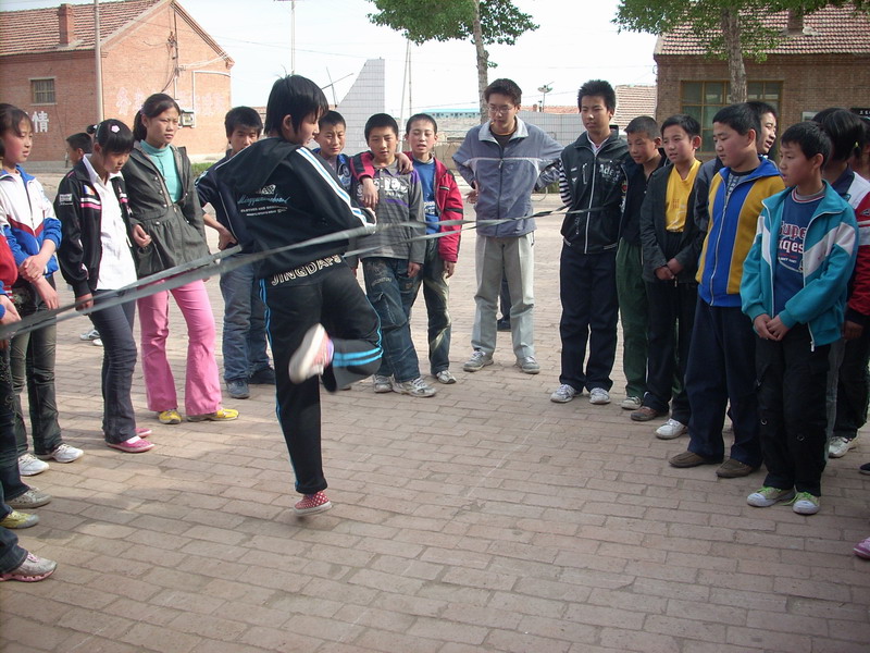 同学们都好奇的围过去,按照比赛规则,我们女同学八个人站在一排,有两个力气大的男同学分别抓在绳子左右的末端。绳子摇起来了,我们八个人跳起来了。可是,这一跳发现问题了,八个人跳的高低不同,快慢不同,跳大绳练习的第一次就失败了。