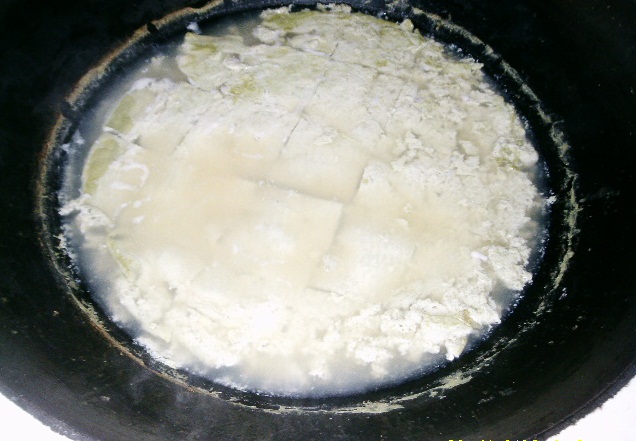 今天的豆浆多,只得在灶上用柴锅来做了。我先把火烧起来,然后我把磨好的浆倒入锅中开始煮,煮沸之后,又舀起来装在一个布袋子中沥,豆浆流出来,豆渣就剩在口袋里了。 再把沥出来的豆浆倒入锅中继续煮,煮沸之后,在妈妈的指导下,我开始用石膏水点豆花了,这是最关键的一步,石膏需放得均匀,边放边搅,搅匀之后就用小火慢慢煮,直到豆腐成型,就算做成了。
