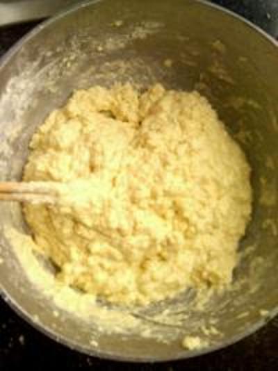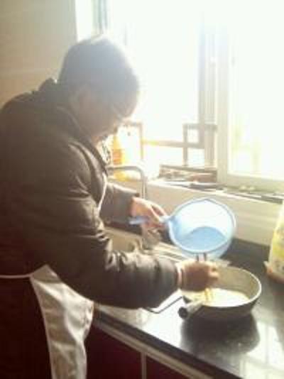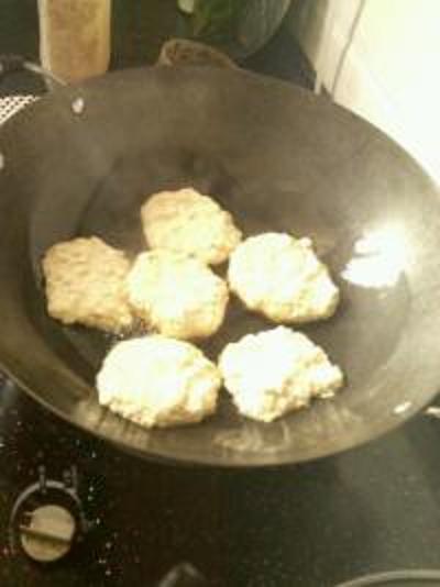 奶奶先是拿出来一袋玉米粉,又拿出舀水用的瓢,让我把玉米粉倒进了瓢中,加上水,奶奶给我示范怎样和面,然后就让我做。 面和好了,奶奶又教我捏饼。面饼做好了之后,奶奶点燃炉子,放上锅,把油倒在锅里烧熟,她又给我示范怎样把捏好的饼放进锅里煎。 看有些饼煎得差不多了,奶奶又告诉我怎么把饼反过来煎。