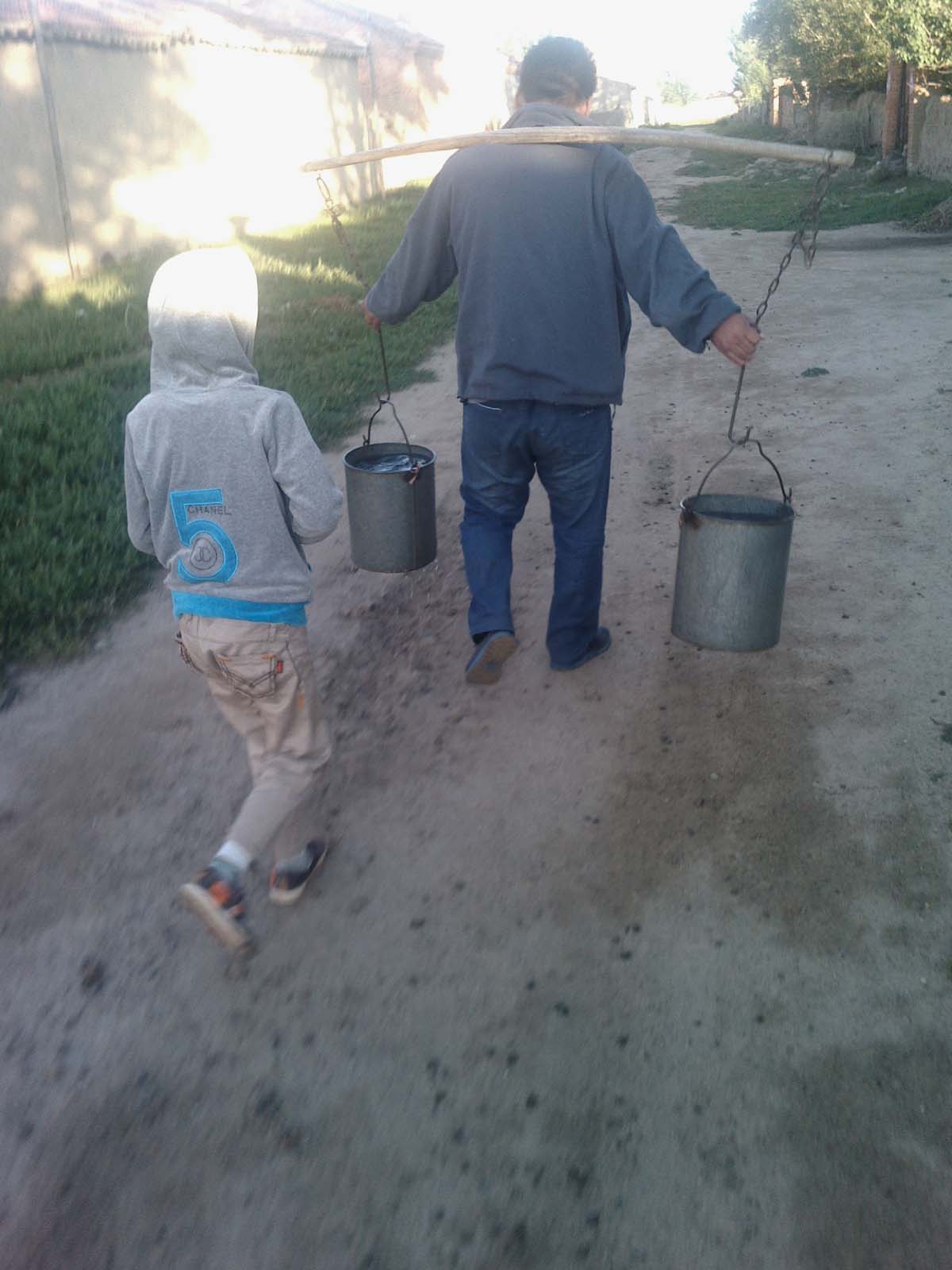 早晨我和二姨夫一起去挑水,水井不是很深,得用一个小桶拔水倒进桶里。拔满水后,二姨夫就试着往肩上放扁担,咬着牙一使劲,水桶离地了,可是却一个高一个低。勉强走了几步,水桶左右乱晃,桶里的水也撒了很多。溅得裤腿都是泥点。