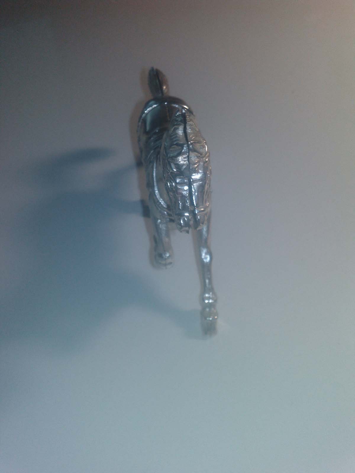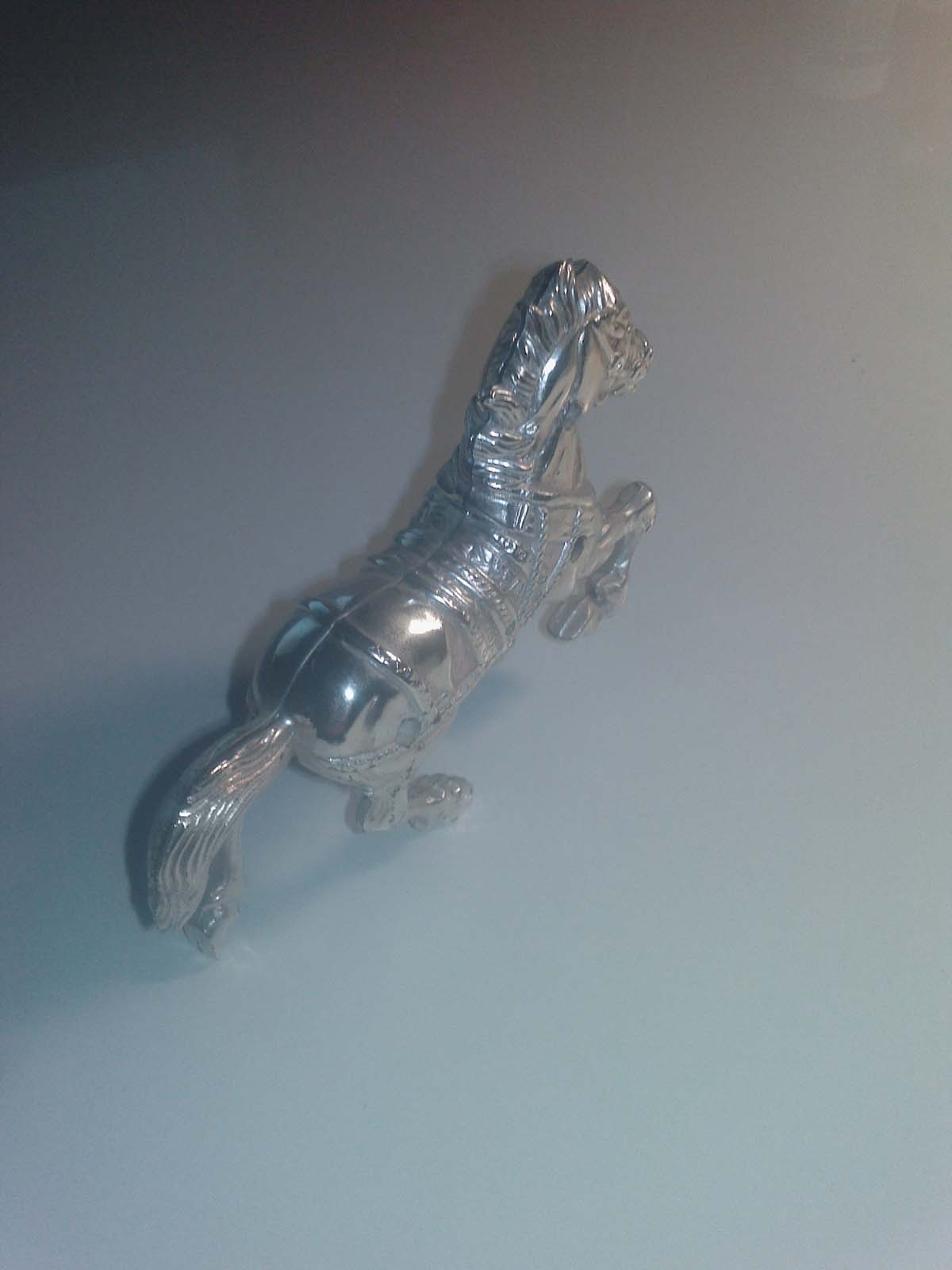 小银马的尾巴向后甩起,头略向内收,它虽然不动,却像极了驰骋沙场的战马。神勇地向前不畏一切。我们多么需要这样的精神啊,在学习上,在生活中。不要遇到困难就逃避,要有马的这种勇往直前的精神。