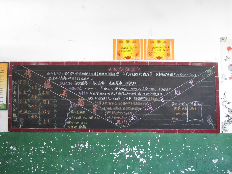 一"我们的班集体 这部分放在中间,也是最显眼的位置。为的是希望同学们牢记我们班的目标,班级口号。班级理念和奋斗誓言,在为此去拼搏,去奋斗,去努力。