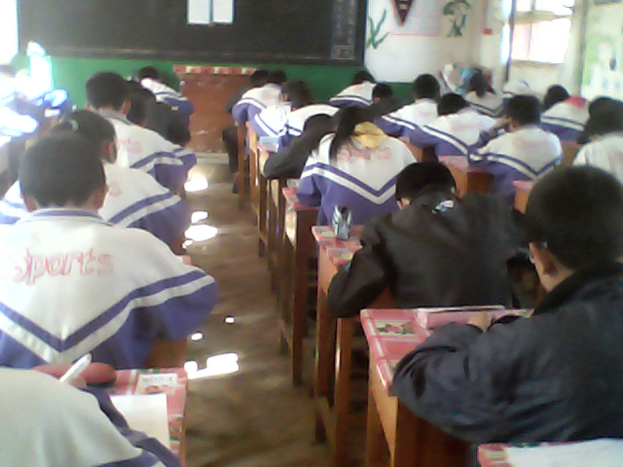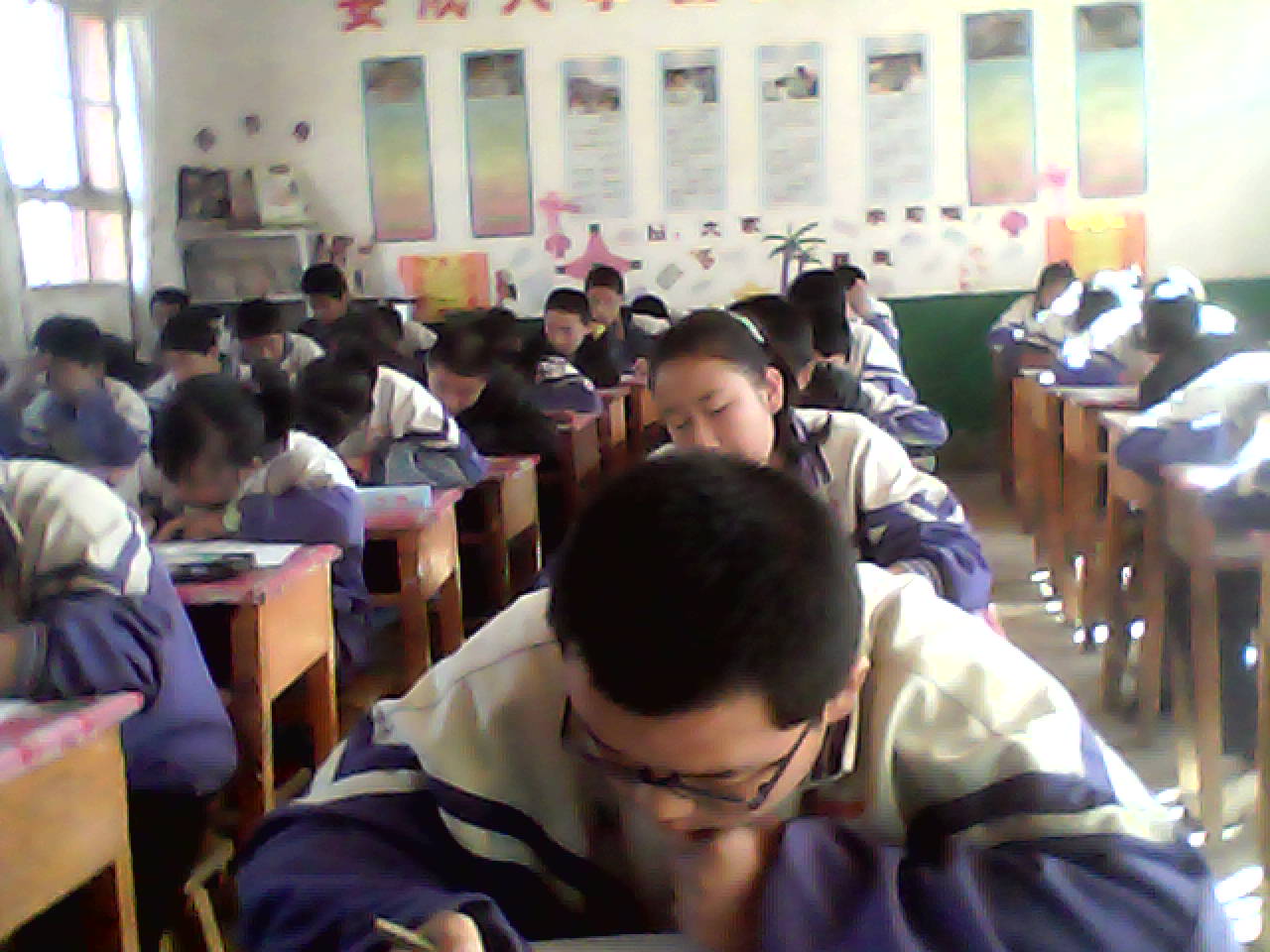 本学期的期中考试开始了,我们学校考试比较严格。七、八、九年级的学生插花搭配考试,每个考场里或七、八年级搭配,或八、九年级搭配,或七、九年级搭配。我被安排在了第三考场。
