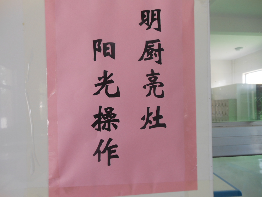 厨房虽然不大,但里面的设备一应俱全。燃气灶、大蒸车、电冰箱、消毒柜、消防器材等各就各位,各种洗刷干净的厨具摆放得井然有序。新食堂的左侧,是一排靠墙的水池,为食堂工作人员和就餐的同学们提供了许多方便。