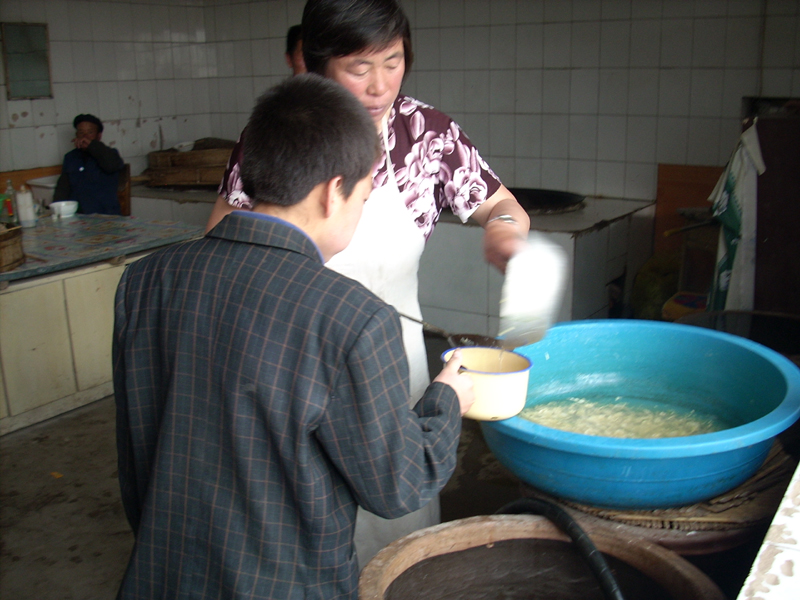 在食堂的北面是三口大锅,这锅算是特号锅了吧,很大。一个用作做菜,一个用于蒸饭。做菜那锅很干净,大概是因为每天油浸的结果。黑亮黑亮的。蒸饭都用的笼屉,一蒸就是好几层。