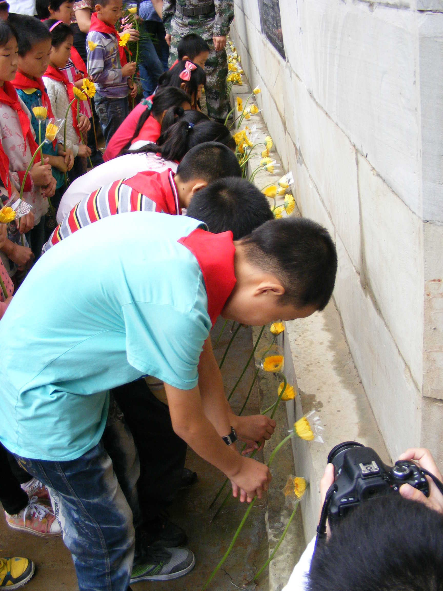 国歌响过,主持人致词,接着有两位军人抬着花环向"烈士"们走来,瞧,他们精神抖擞,神情庄严,当然这也体现了他们对已故烈士的尊重和敬仰。花篮献过之后,全体默哀,然后是为烈士献花。我们每个人手拿着一朵金灿灿的菊花,依次上前为已故事的八烈士敬献鲜花。在那一瞬,我的脚步突然变得如此沉重;又是如此坚定。