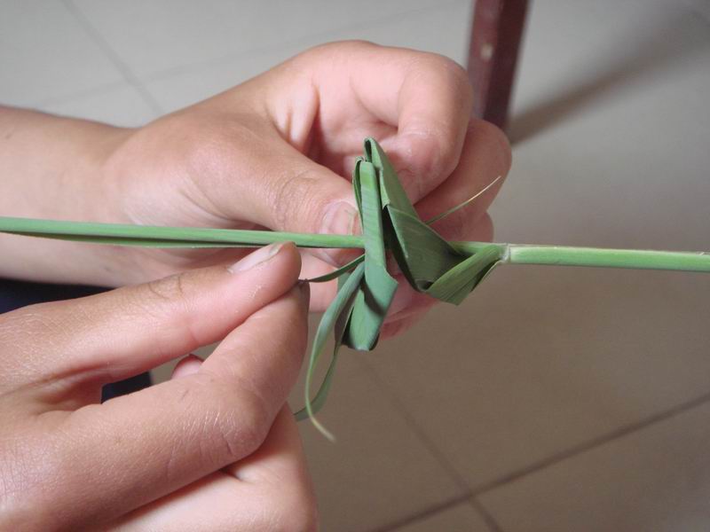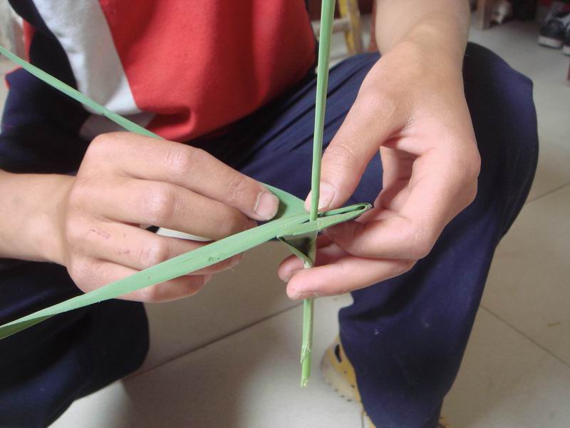 第二步,将留下的芦苇叶沿着芦苇杆扎进去,就做成功了。简单吧!