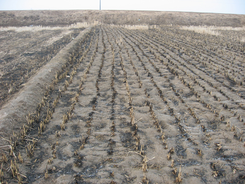 在10-11月份,或者冬天,开始烧稻根。烧稻根也要选择天气,一般是选择刮风的天气,因为秋天天气干燥,加上刮风,火势蔓延迅速,这样烧稻根又快又干净。烧晚稻根后,田野上呈现出一片黑黝黝的景象。其实这样做是不对的,应该用犁把稻根翻到土里,让稻根在土里腐烂,从而转化成养分,渗入到土壤里,有助于春天的播种。