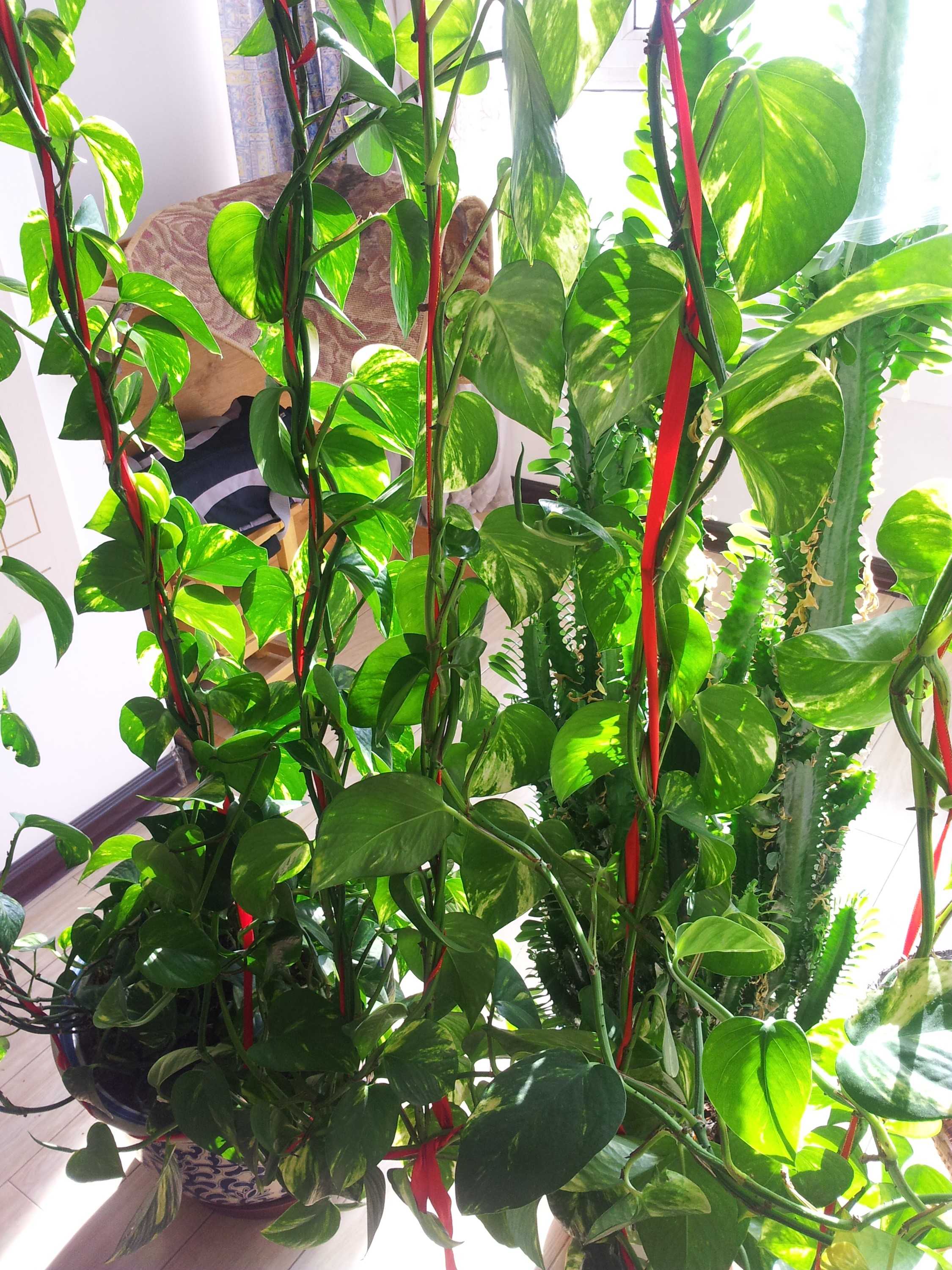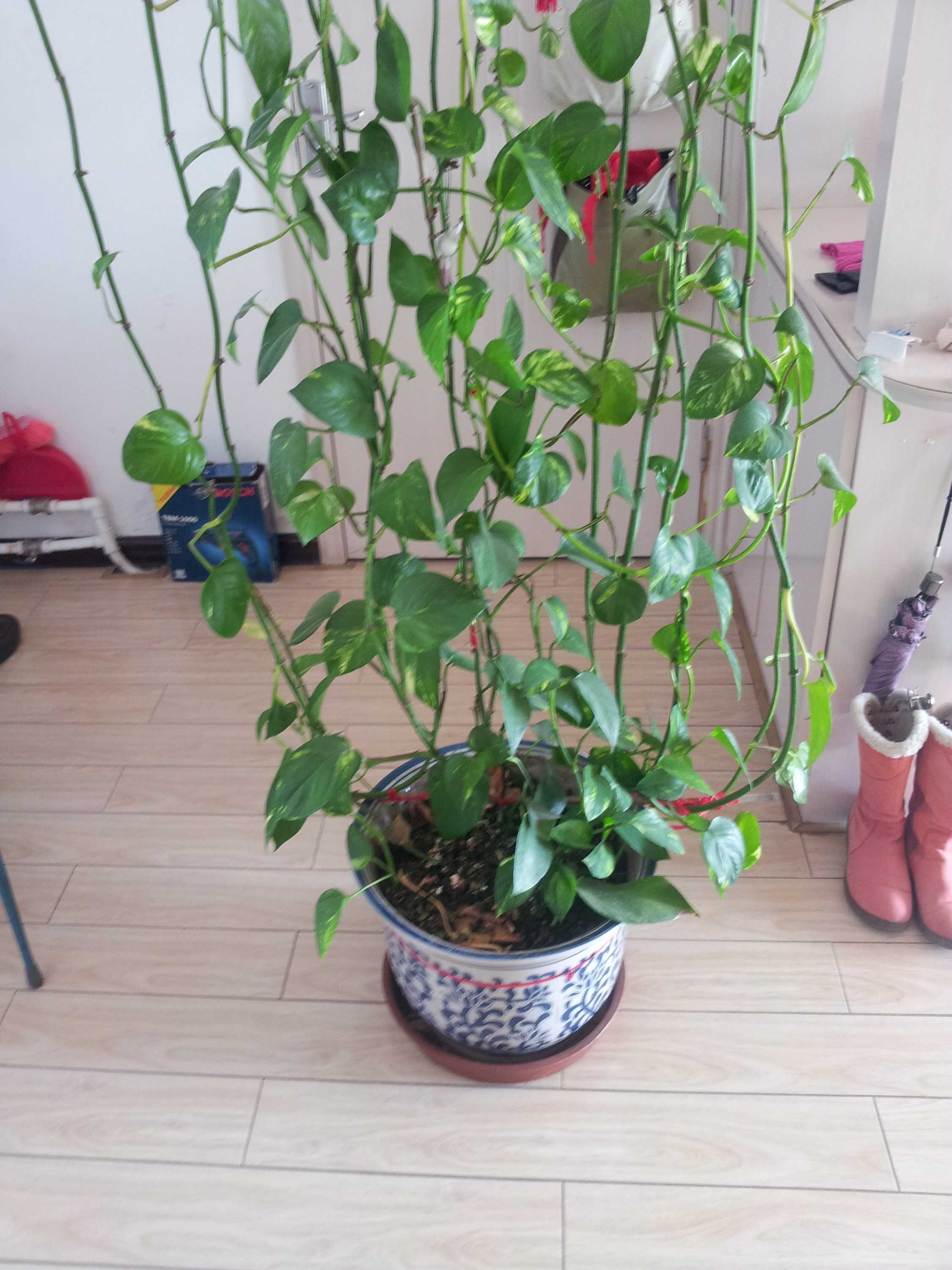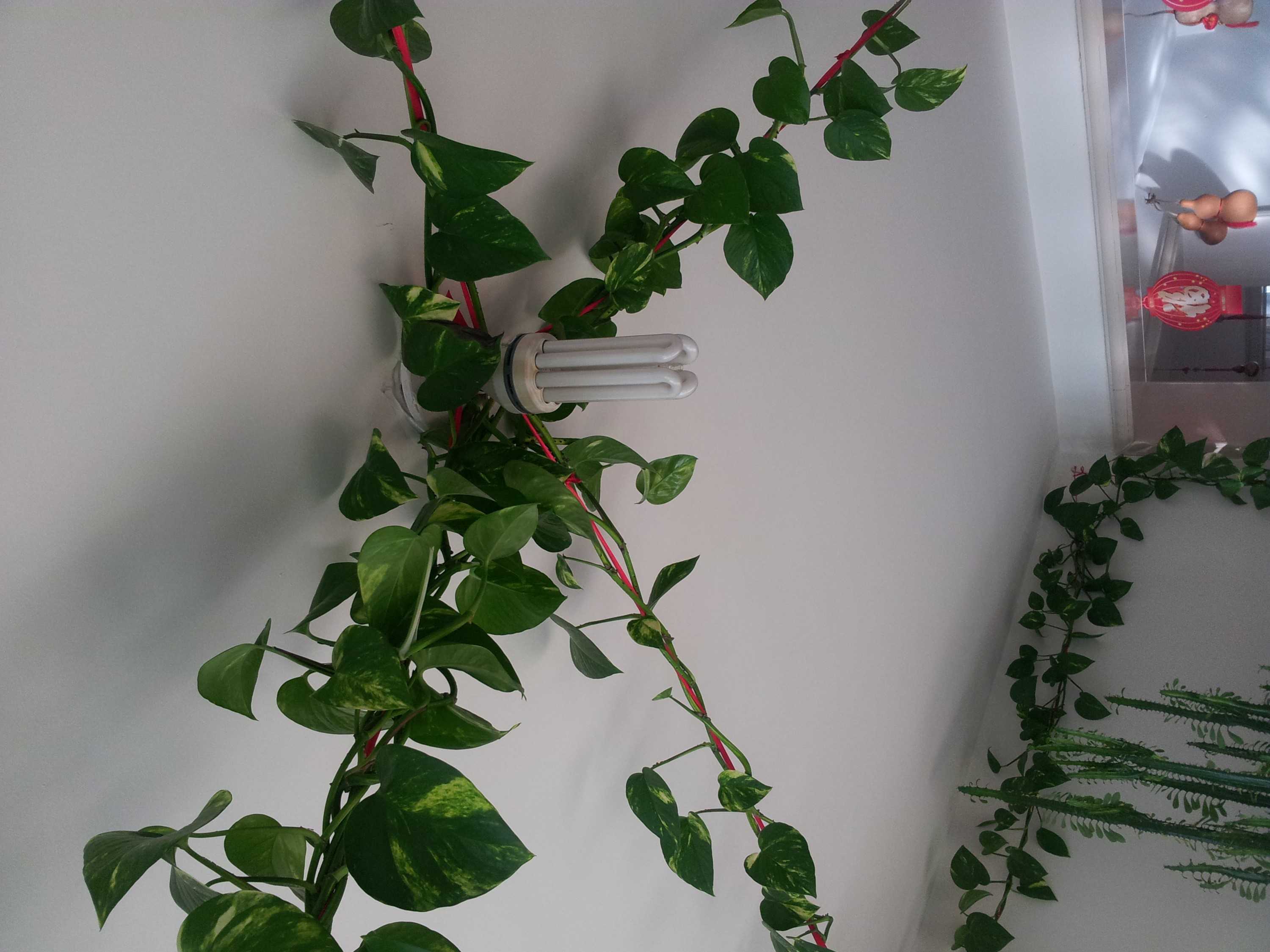 饭厅里还有一株,由于饭厅位置狭小,不便将其挂在房顶上。但这可难不倒父亲,父亲在房顶固定了两根绳子,然后系住一个圆筒,把叶子缠绕在圆筒上。饭厅里又有了"一条瀑布"。