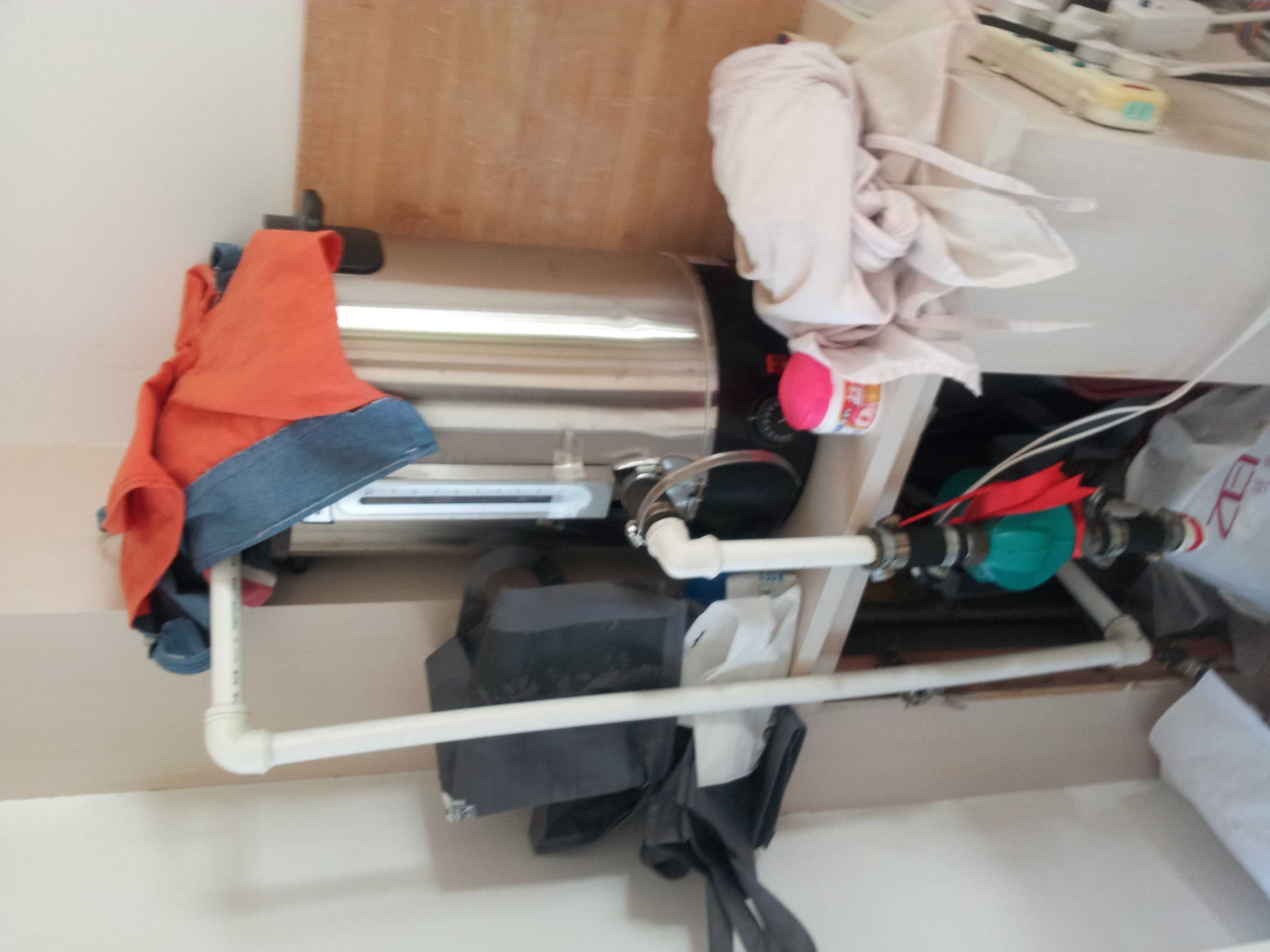 右图这是我们家的"暖气"。 也许有人会问:"这不是电热壶吗?"没错,这的确是一个电热壶,但是我们父子俩利用它可以制造热能源的作用,把它当成了"锅炉",再安上一个泵,负责运输水,把暖气头那里的水管接到了"锅炉的"的出水口,沿着泵,输给房子内所有的角落。然后在暖气的出水口截断,把它连接到"锅炉"的上方。一个简易的取暖装置,就OK了!