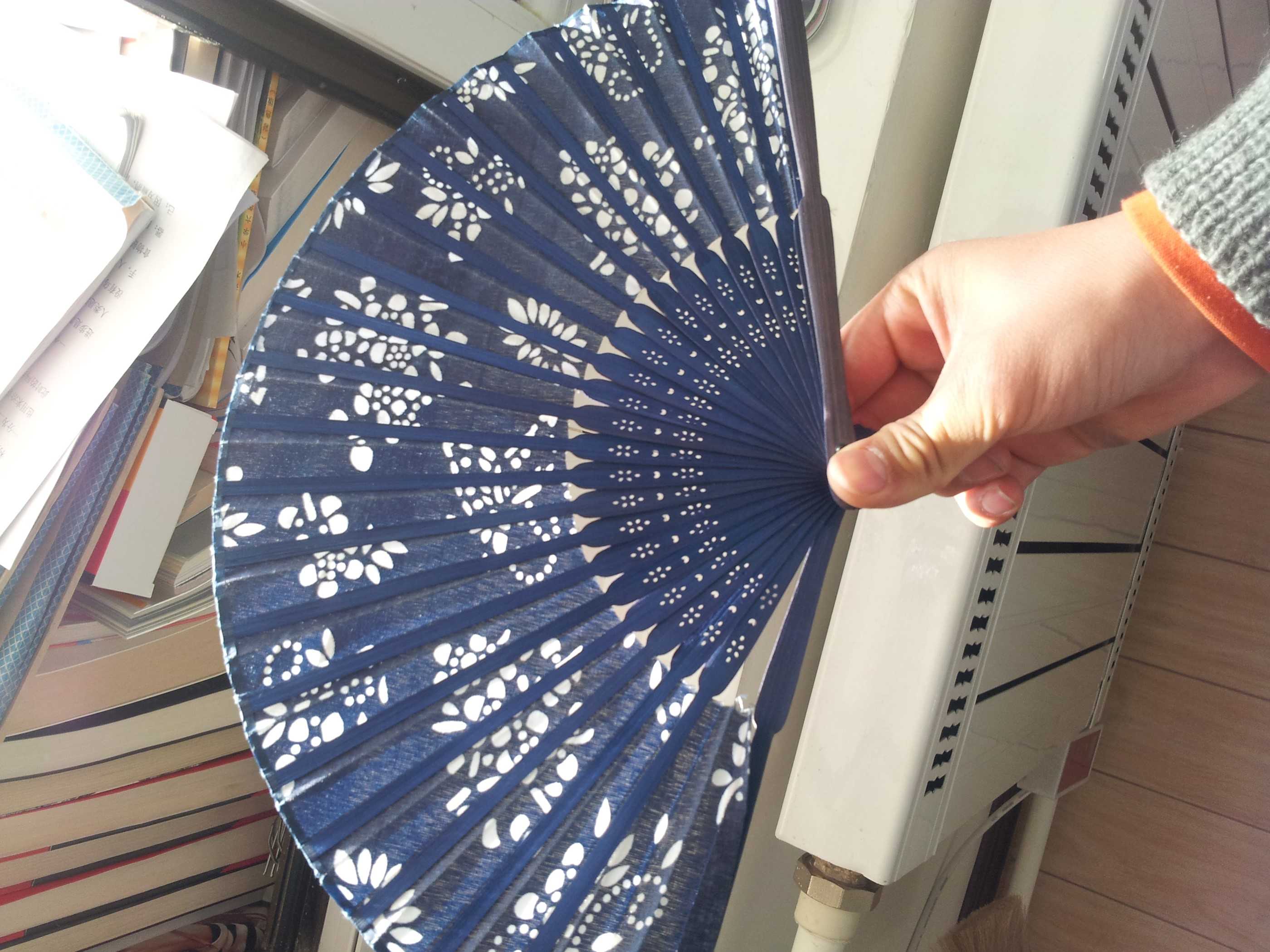 这把扇子则是我的一个生活在江南的远房亲戚送我的,他在苏州以卖扇子为生,有一次去了老家,送给了我这把扇子。扇子做工精美,框架由染过色的竹子构成,闪烁着凝练的光。开扇时清脆有声,利利索索,收扇时也是从不拖泥带水。这就是我们家的手工艺品。