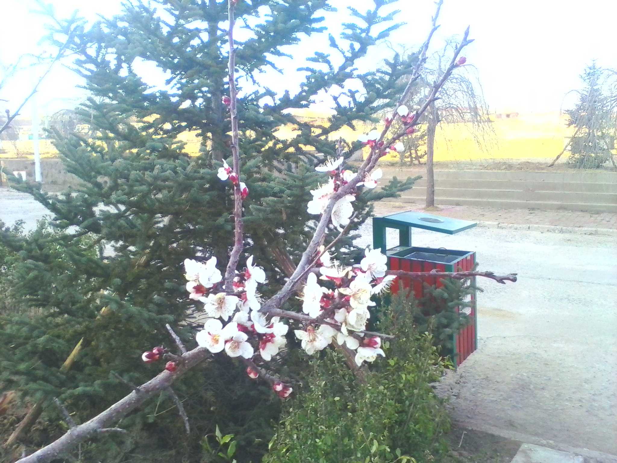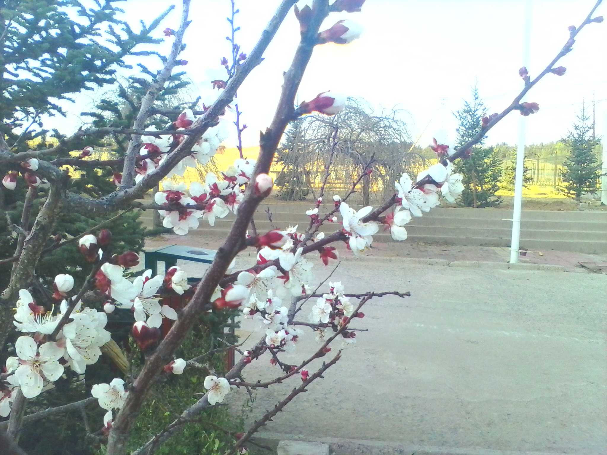 下雪了,雪花堆积在松树枝上。因此,松树的顶部都变成了白色,像是给松树戴上了一顶顶白色的帽子。绿色与白色相到映衬美丽极了,再加我们的学校就形成了一道靓丽的风景线。