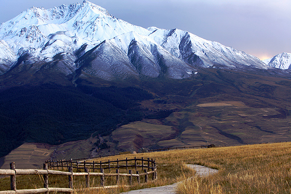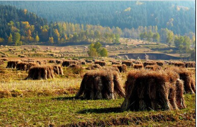 一座座农家小院错落有致。院内堆放着金灿灿的小麦,随意搭建的简陋土墙毫无美感,院内的农具也许是因为主人没时间摆弄而四处散落,却构成了一幅绝妙的农舍图。一只爱出风头的公鸡跳到墙上引颈高歌,惊起几只躲在一边的麻雀,它们扑打着翅膀急急地飞向远方,不一会便不见踪影。微风吹过,树木稍稍动了一下它满头的金发,便趋向平静,好像一切都没有发生过。