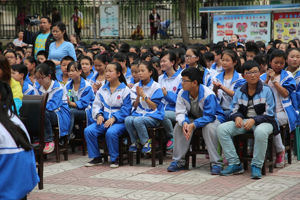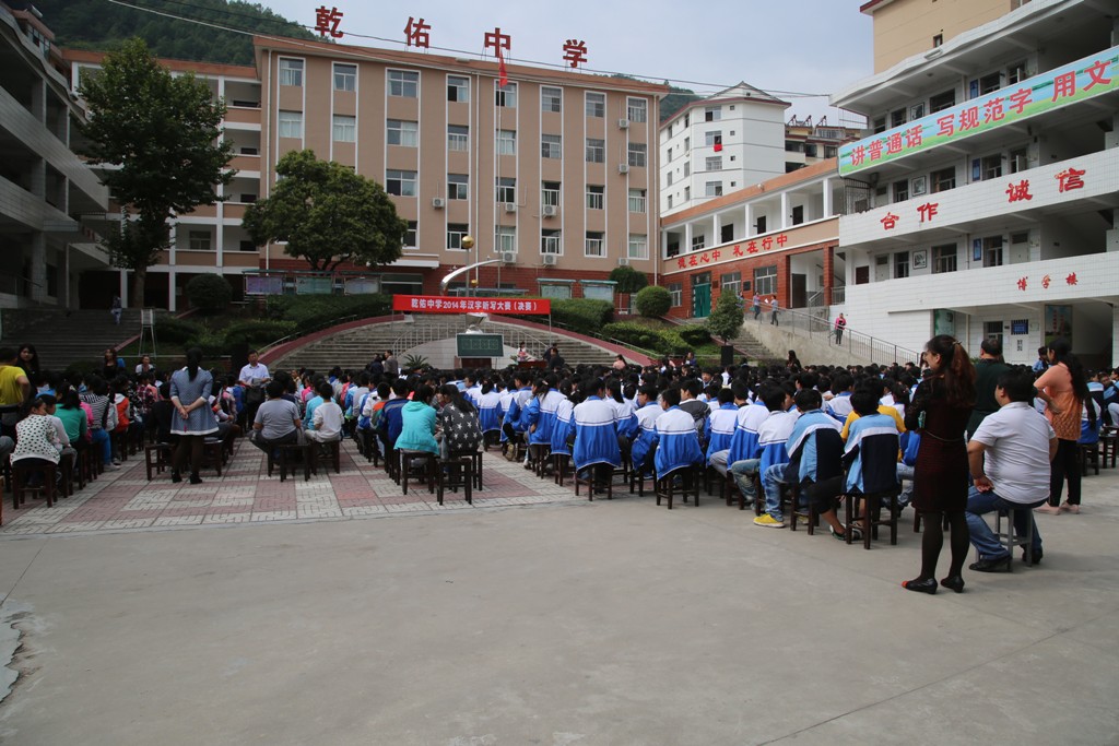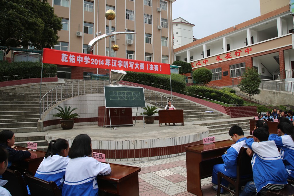看,那么多的学生在院子里做什么呢?哦,仔细瞧瞧,是汉字听写大会呀!这可是我上初中的第一次呢。可是我没参加决赛,看他们也算得上是一种享受了。