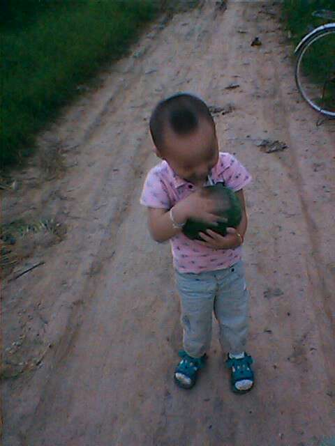 摘到大西瓜的他,抱上西瓜赶紧向家跑。城里的小弟弟真可爱!