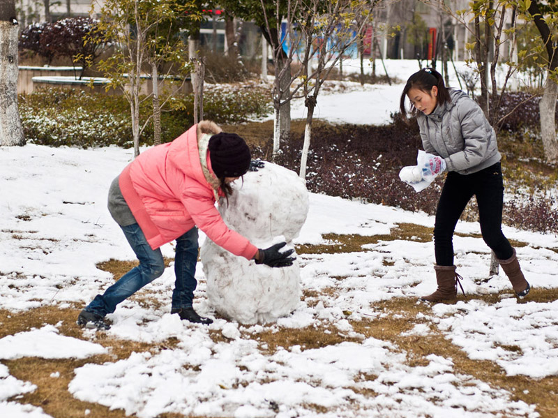 早晨,我们非常高兴,像过节一样在雪地上玩耍,一张张红彤彤的脸上洋溢着欢快的笑脸。上班的大人们还是一样的忙碌,悠闲的老人们,一边在屋里取暖,一边看着门外,嘴里念叨着:"好雪!好雪!"