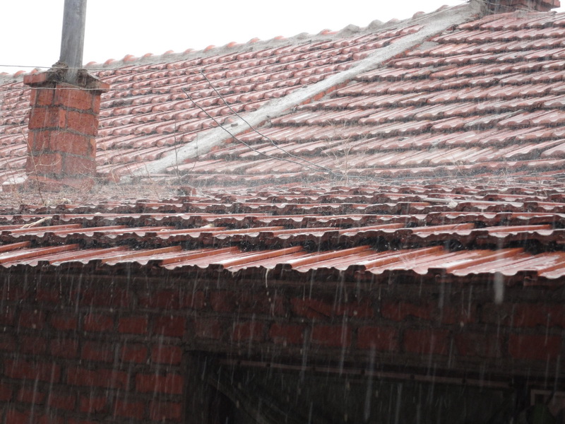 唰——唰——唰——雨姐姐尽情地倾倒着。雨拍打在窗户上,发出"啪——啪——啪——"的响声,像在给雨姐姐伴奏似的。再看屋前的房顶上,水花四溅,把砖瓦清洗的格外鲜艳。