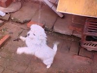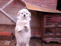 我家的狗,它长得很可爱,身上有棕黄色和雪白的毛,樱桃般的小嘴,我们给它起名叫"豆豆"。"豆豆是个很可爱的动物,它很温驯,见了人总是喜欢摇尾巴,你如果蹲下把胳臂伸出来,它就会学你的样子,把前面的两只爪子放在你的胳膊上,向你吐舌头,好像是在向你炫耀自己有多么美丽,豆豆也非常厉害,它可以前面两只爪子离开地面站起来。