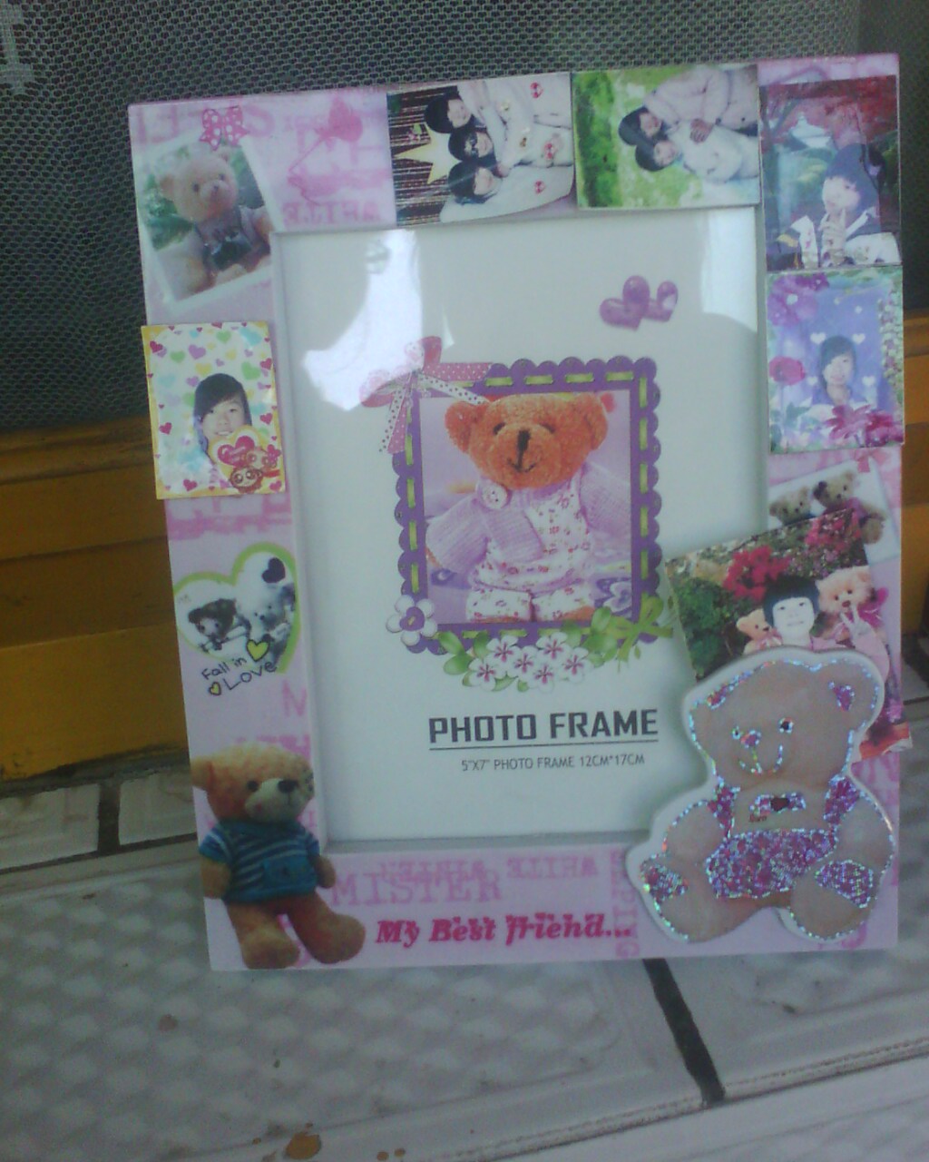 相框上刻有许多的小熊,五颜六色,大熊猫还是笑嘻嘻的。好像是在迎接我这个小主人,相框上贴满了我与好朋友珍贵的回忆,看,那照片,我两靠在一起,自己的双手搭在她的肩上,后面有大草原作为背景,我无时无刻不在想着那美好的一瞬间,仿佛眼前定格在哪,我心里是温暖的。