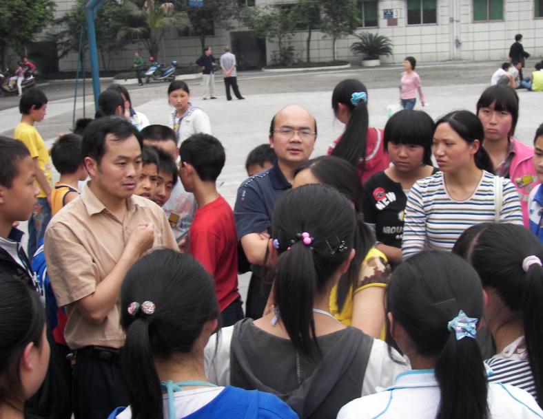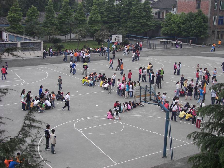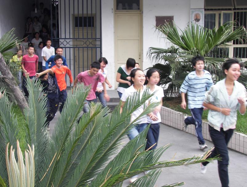 幸运的是,同学们都很快下楼到了操场上,教学楼没有倒下,同学们也没有受伤,只是三年级的教室有所损坏,二年级楼上的教室轻微裂开。同学,老师们都聚集在操场上,初遇地震,很多同学都吓哭了。