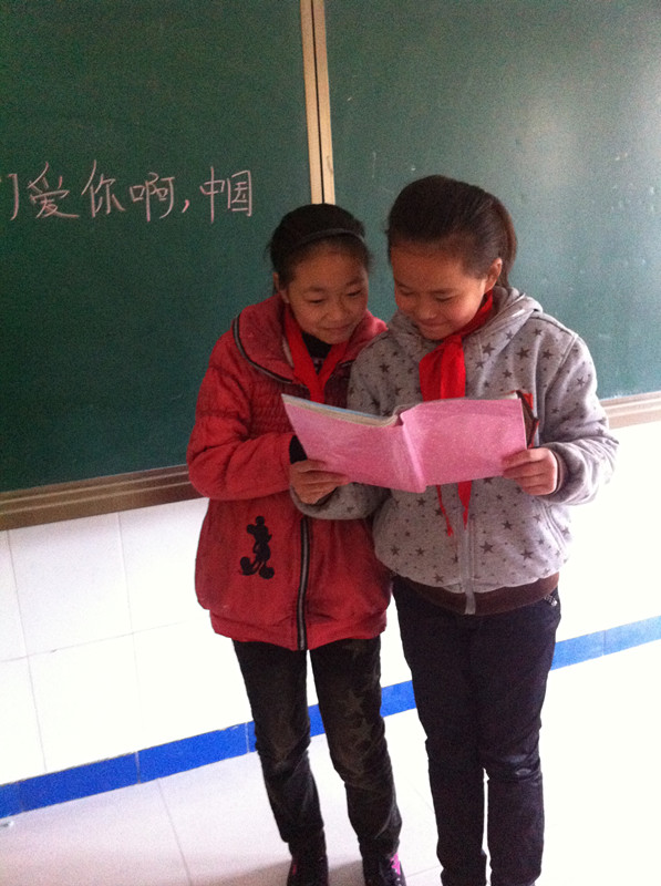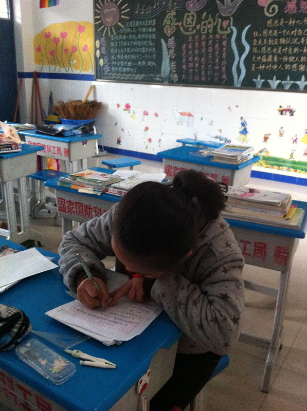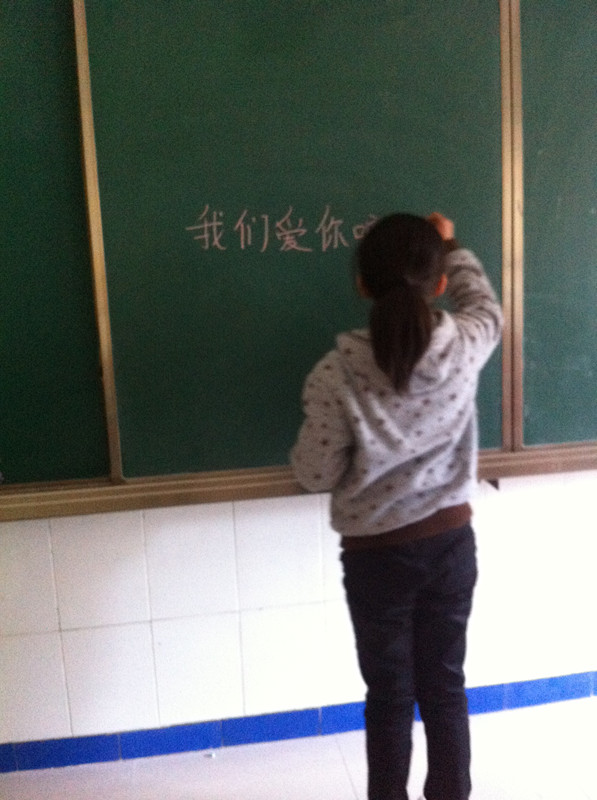 看,下课了,她拿着语文书走向讲台,拿起粉笔就开始在黑板上写了。不一会,几个大大的字"我们爱你啊,中国。"就展现在了黑板上,之后她又把书上的笔记一一写在黑板上。