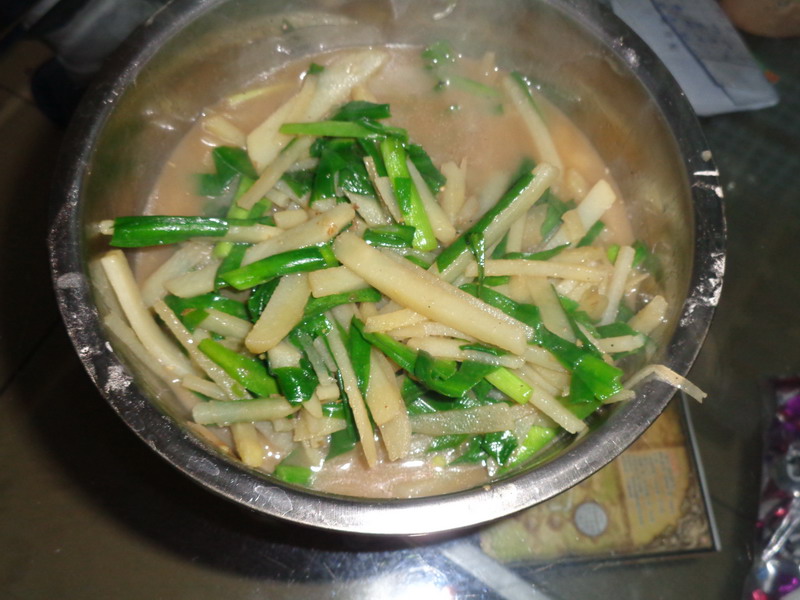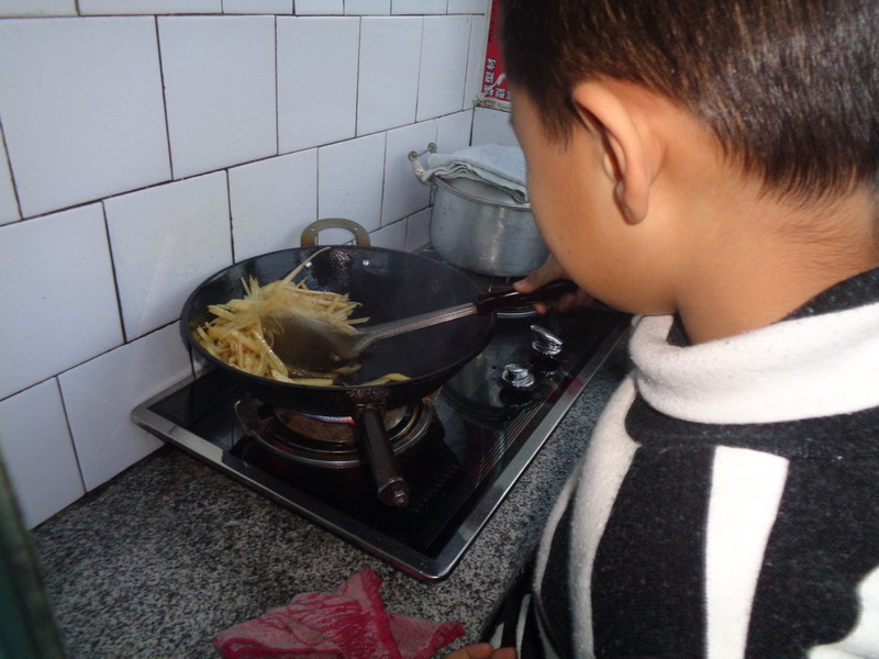 我打开煤气灶,往锅里浇了一点油,过了一会儿就把土豆丝放到锅里,来回进行翻炒,我等了有一段时间,然后放了一些调料和盐。翻炒了几下后,我就问爸爸可以出锅了吗。爸爸尝了一下,就说可以了。并露出了满意的笑容。但是也对提出了意见,说我在放油时,不要把油放多了,在翻炒时要做到均匀,要不然菜就会一半是熟的,一半是生的,还有放盐和调料时要不能过多,要按照自己的口味放。听到爸爸提出的意见,当时心里别提有多难过、多沮丧了,但我并不打算放弃,我要吸取此次教训,在下次做饭时一定要做好。