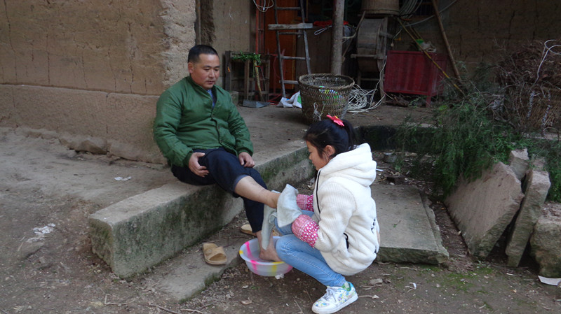 我先让爸爸把脚放在热水里泡了一会儿。
