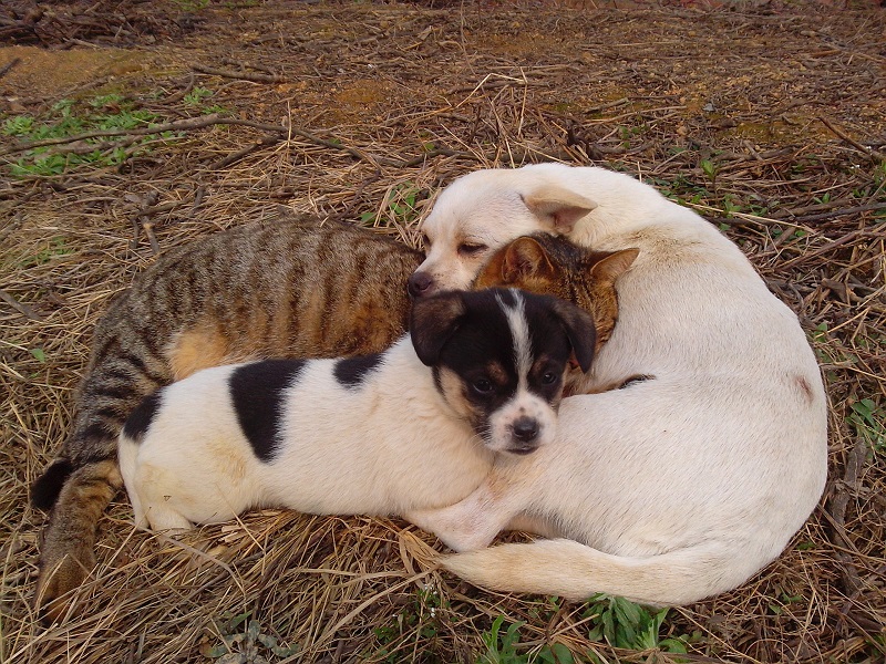 在现实生活中,猫狗只能大战,但在我家它们却很友好,有时打打架累了就一起睡觉,醒了一起吃饭。那天我回到家里看到,他们在一个凳子上睡着了,于是我掏出手机记下了这美好的一幕,他们在凳子上睡得是那么的香,那么的可爱,我都不愿意打扰他们了。