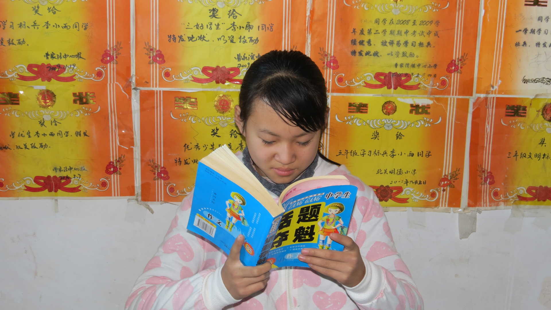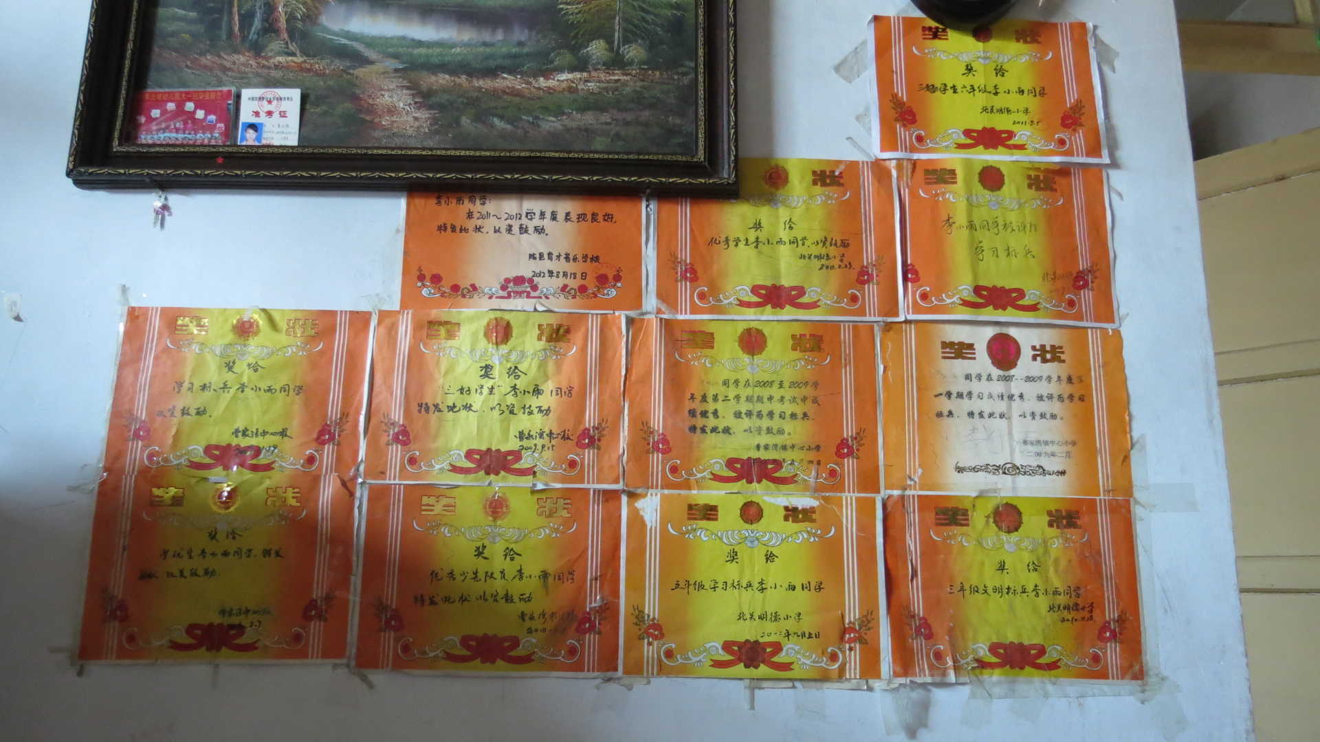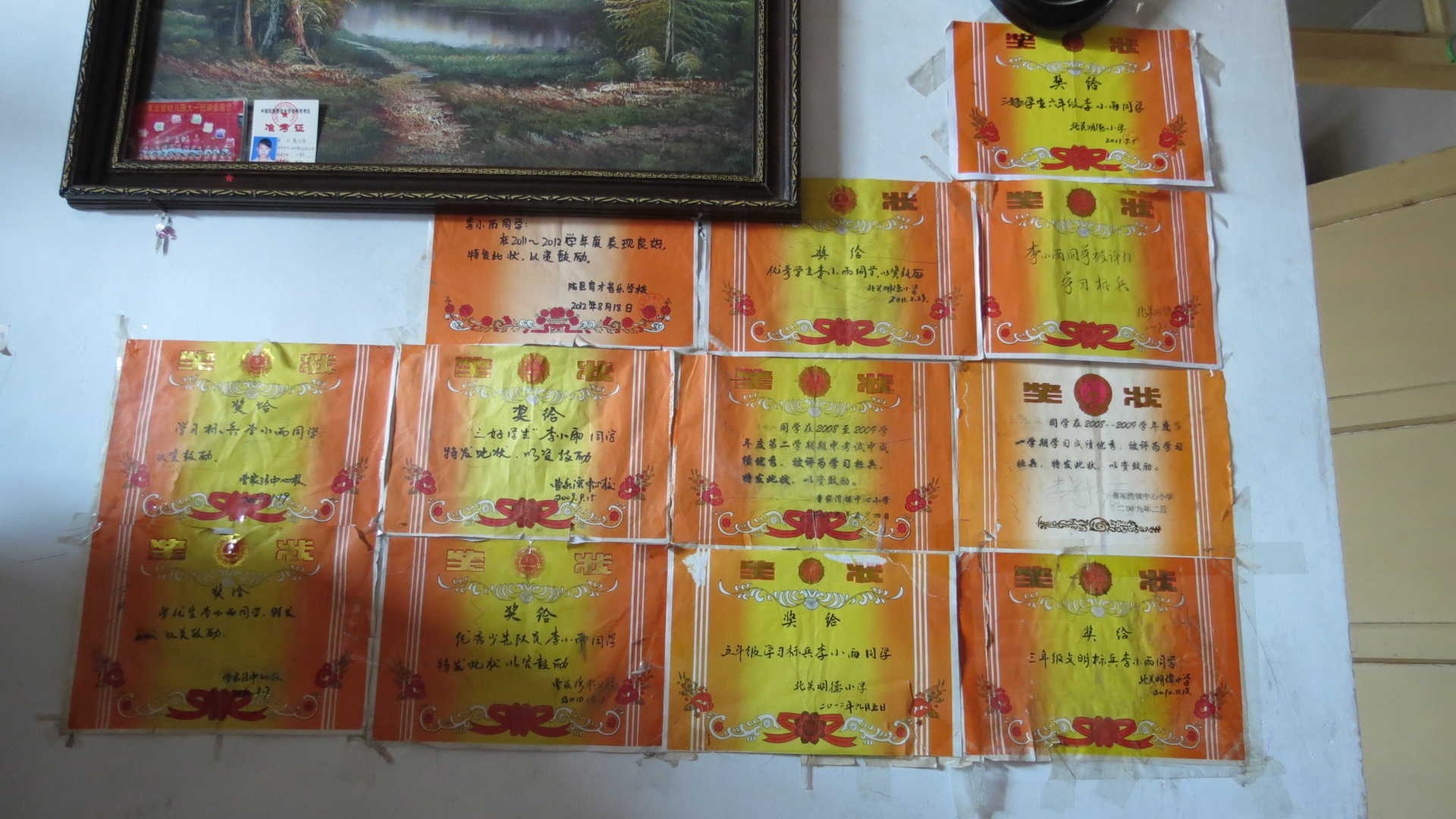 自从我上小学起,爸爸就将家里客厅中最显眼的那面墙分给了我,还美名其曰"荣誉墙"。