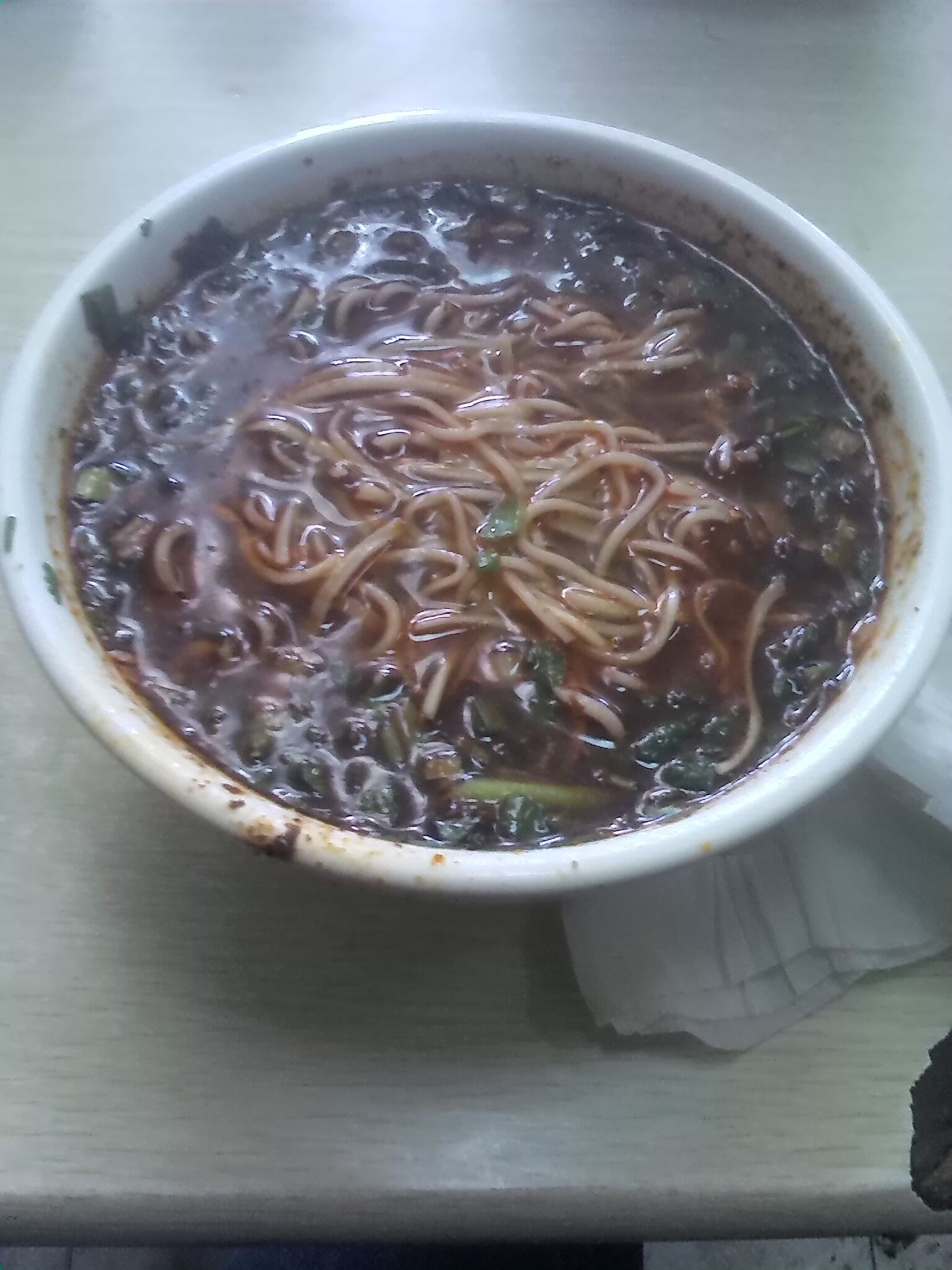 我拿起一双筷子夹了一片牛肉吃了起来。嗯,真好吃!再夹起面条吃了一口。啊,这面条又细又滑,比我们这里的面条简直好吃百倍。老板叮嘱我:"小朋友,慢一些吃,不要烫坏了嘴!"我说:"知道了!"我津津有味地吃着,慢慢地品尝着……