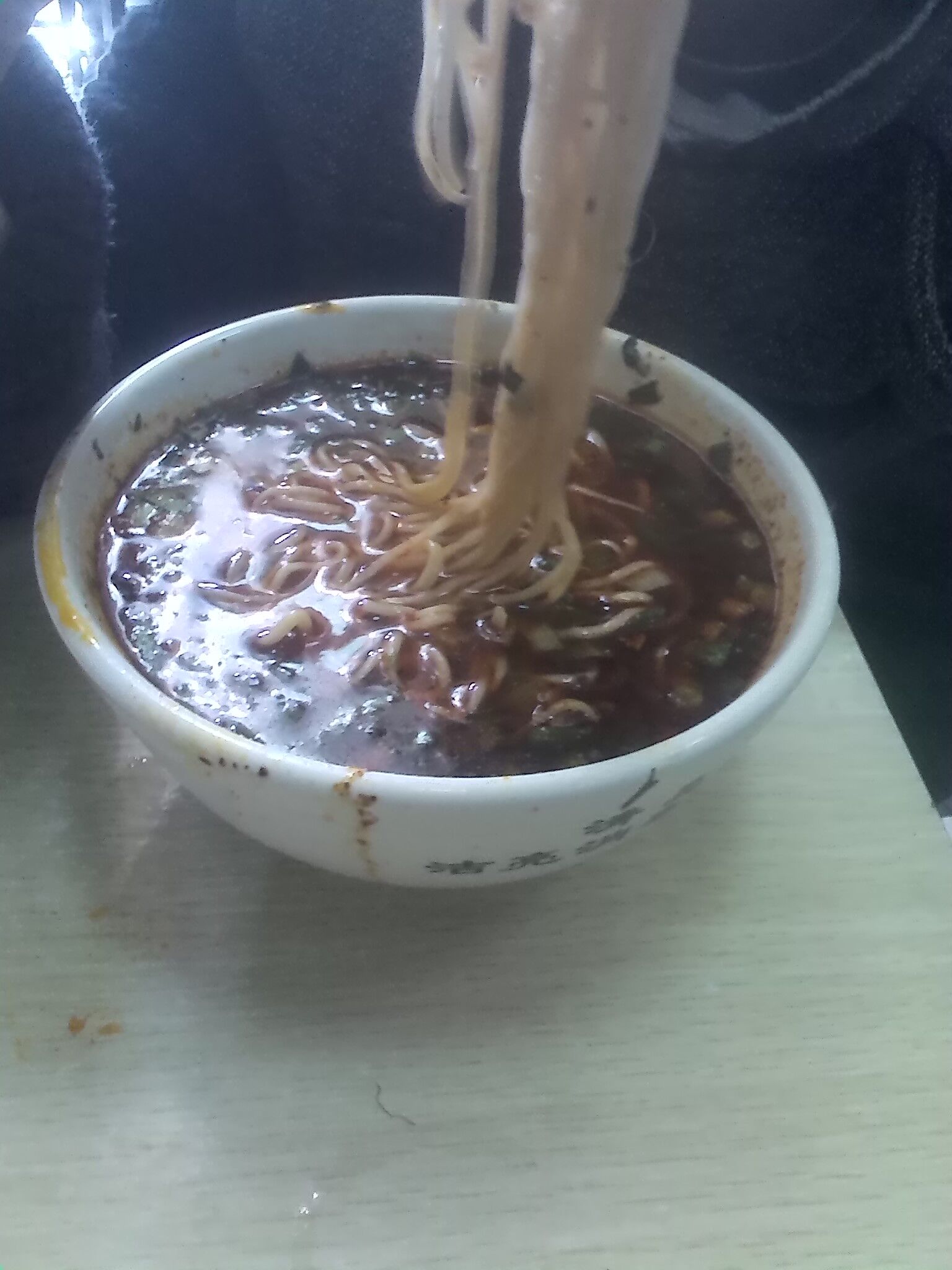 我拿着钱就走出门去。来到了拉面店,我选了一处比较空的地方坐下,大声说:"老板,来一碗牛肉面!"那位老板答应一声,立刻从一团面上拿了一块,然后就动手拉起了面来了。他先把面拉长,然后一个对折,拿住两头继续往两端拉。那面越拉越长,越拉越细。他拉了五六次,那面就变得像头发一样细。接着,他把面放进了一只锅子里去煮。煮了不到三分钟的时间,他就揭开锅盖,把面捞起来放在一只大碗里面。接着,老板拿起一些烧牛肉的汁水放到面上,又放了下一些切成薄片的牛肉在面条的上面。接着,他端起面碗拿到我身前的桌子上。啊,一股牛肉香味直冲我的鼻子。香极了!真是太好了!