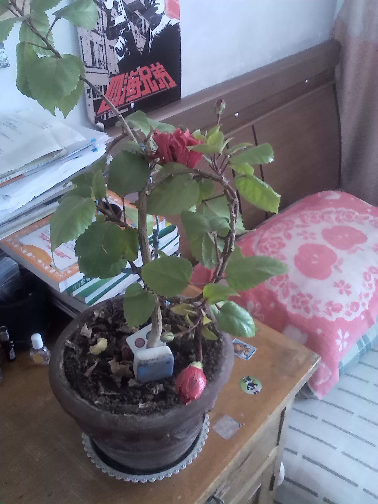 扶桑花的树只有一米多高,是灌木的一种,叶子跟桑树很像,不仔细看是分辨不出来的。 扶桑的叶子尖尖的,花在这些绿叶之间冒出来,格外引人注目。