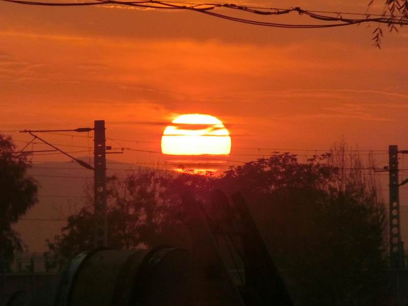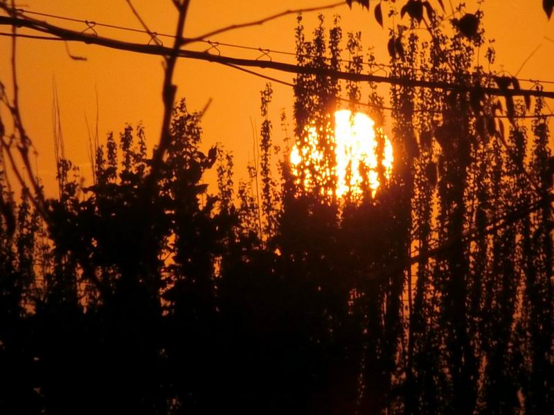 再下沉一点那太阳也好像放大了几倍,就那么挂在天上,一直盯着它看,好像大的要覆盖你的眼睛。那太阳真圆,比圆规画的还圆。太阳颜色也很协调,不再是火红的,颜色慢慢变得柔和,从中间开始,两边先呈醉人的深粉色,在渐渐变成优雅的金黄色,颜色过渡的天衣无缝。