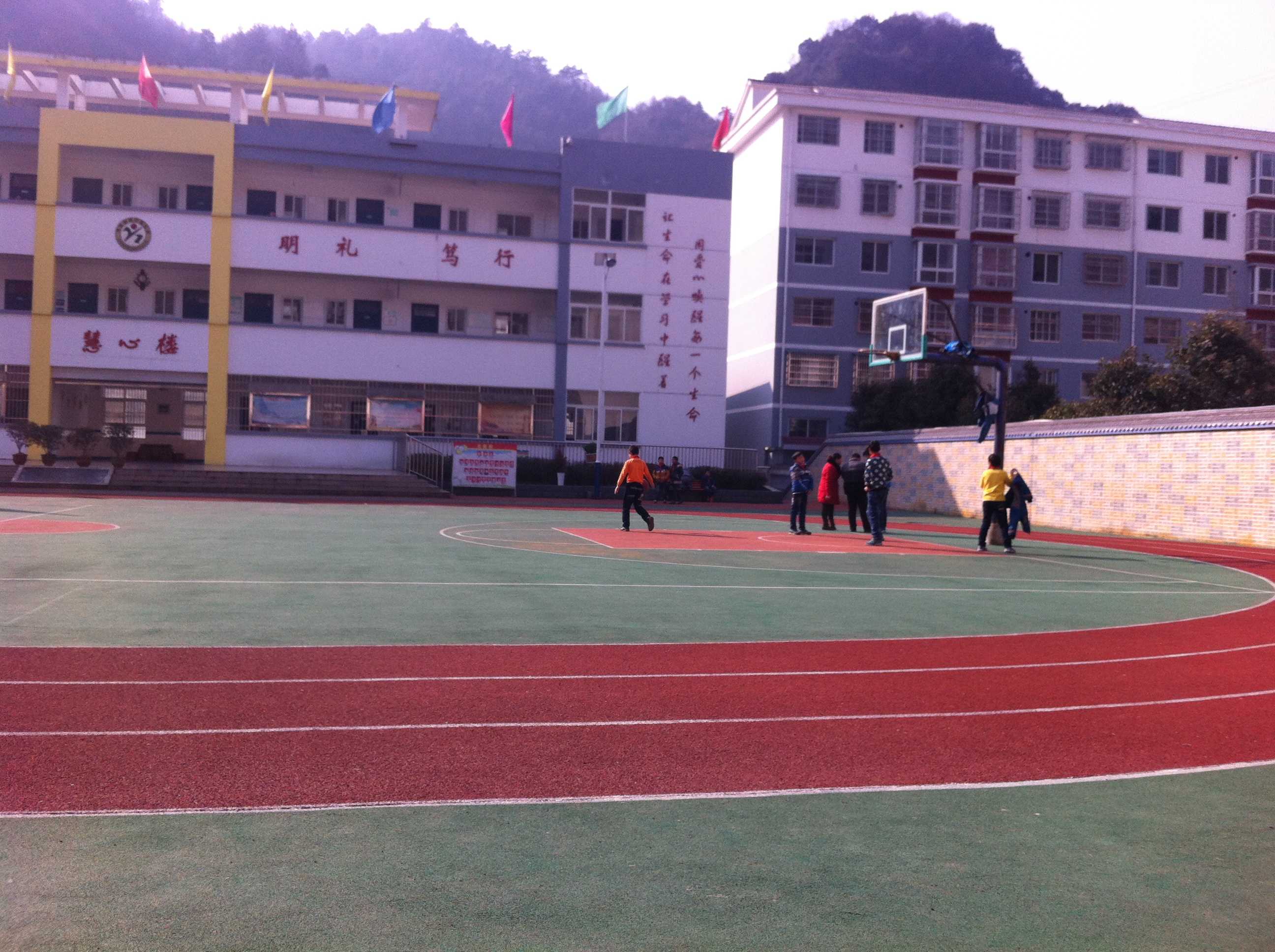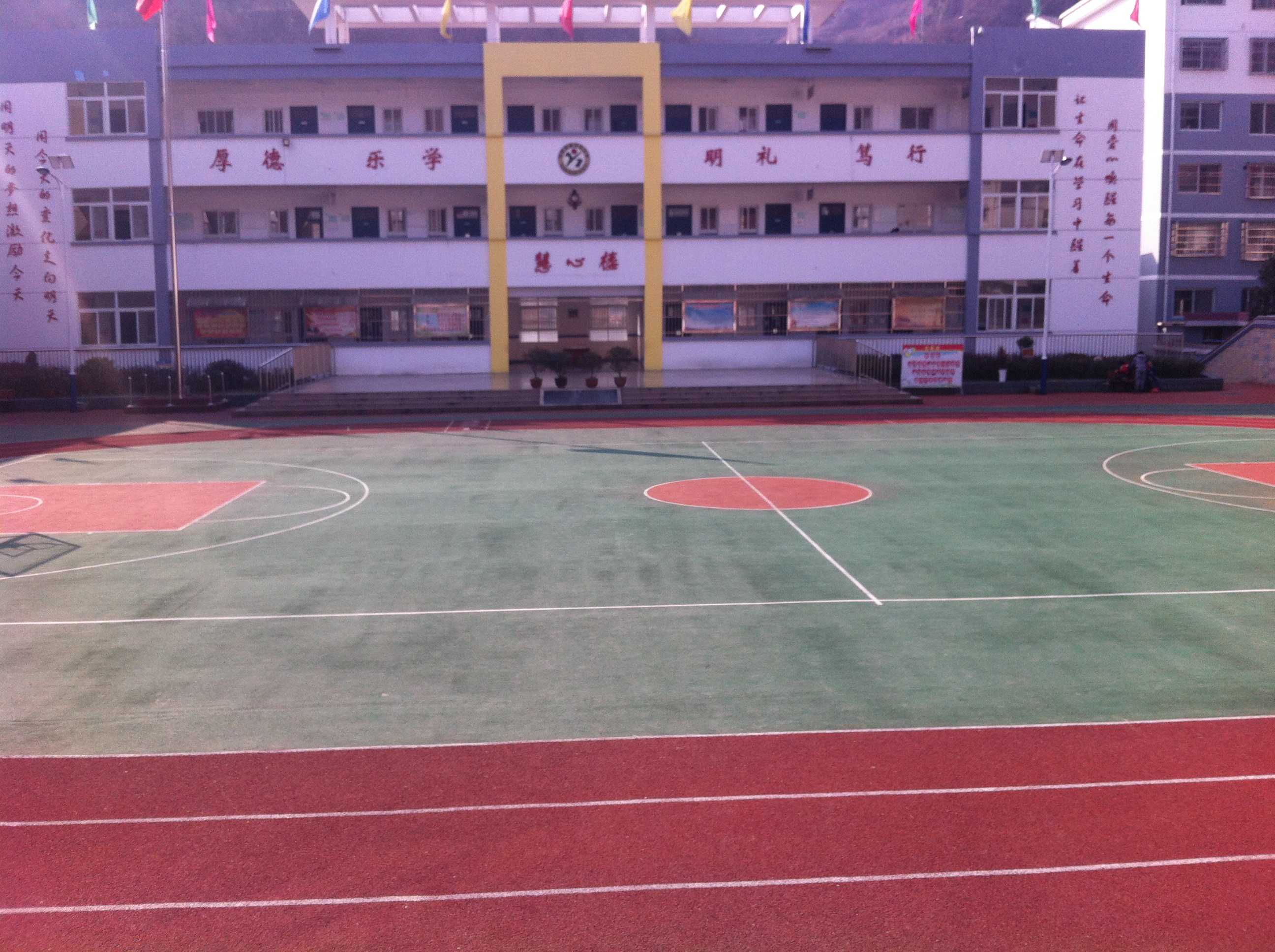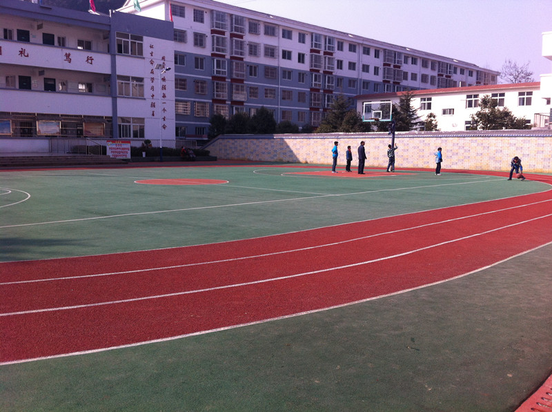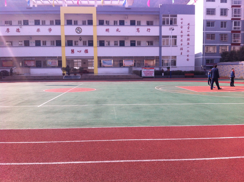 操场上有一个篮球比赛场,还有一条长龙般的跑道。我们每天踩在这舒软的跑道上,感觉生命是多么的富有活力。