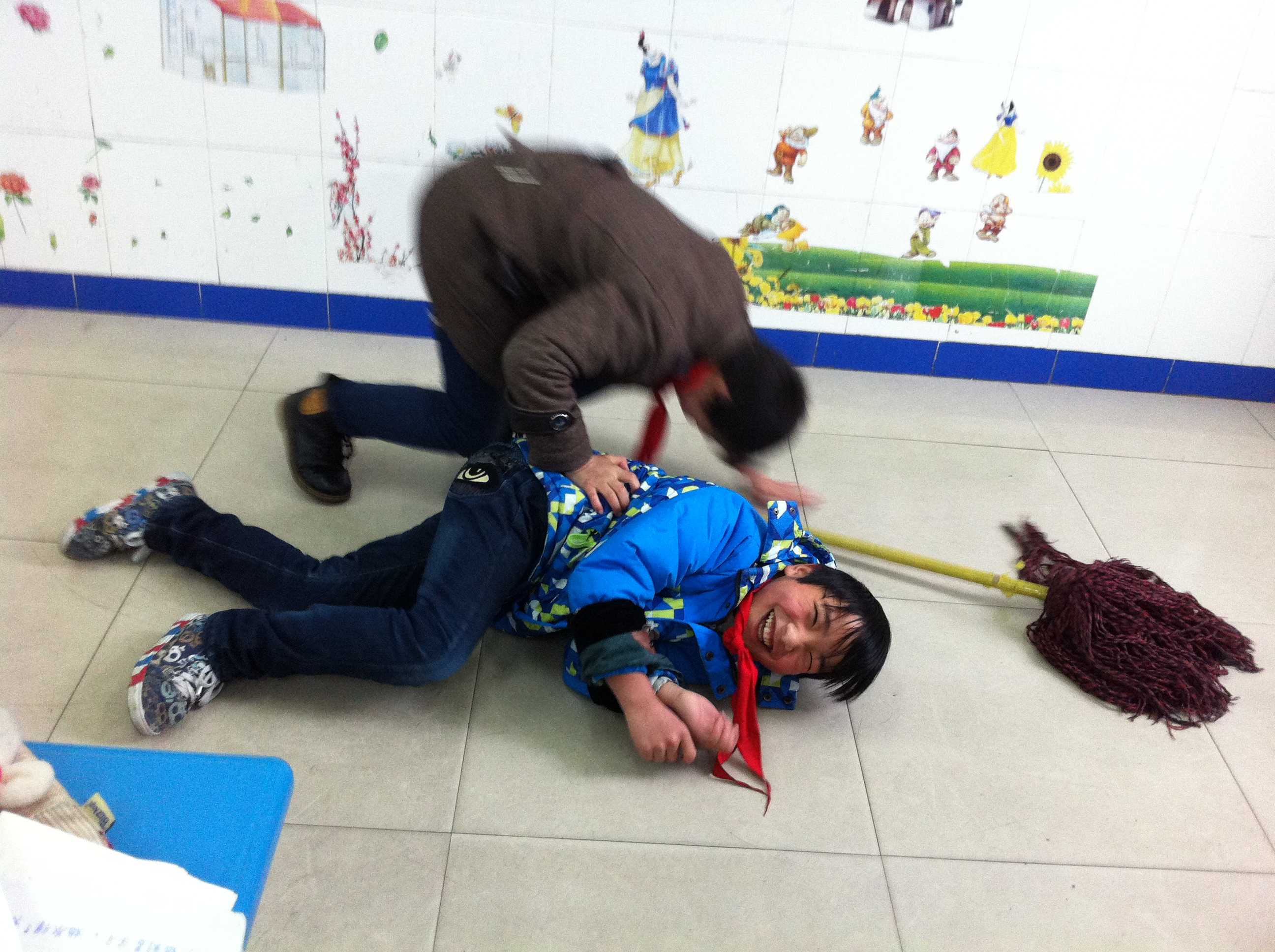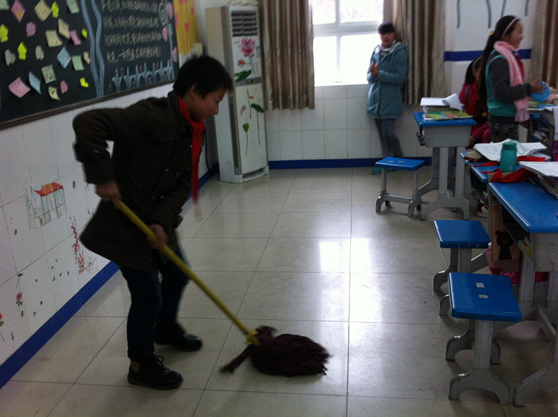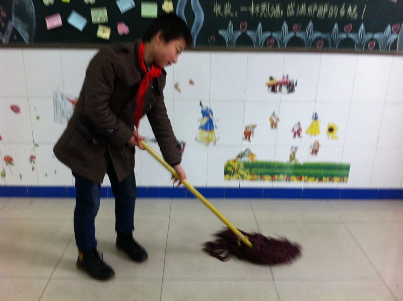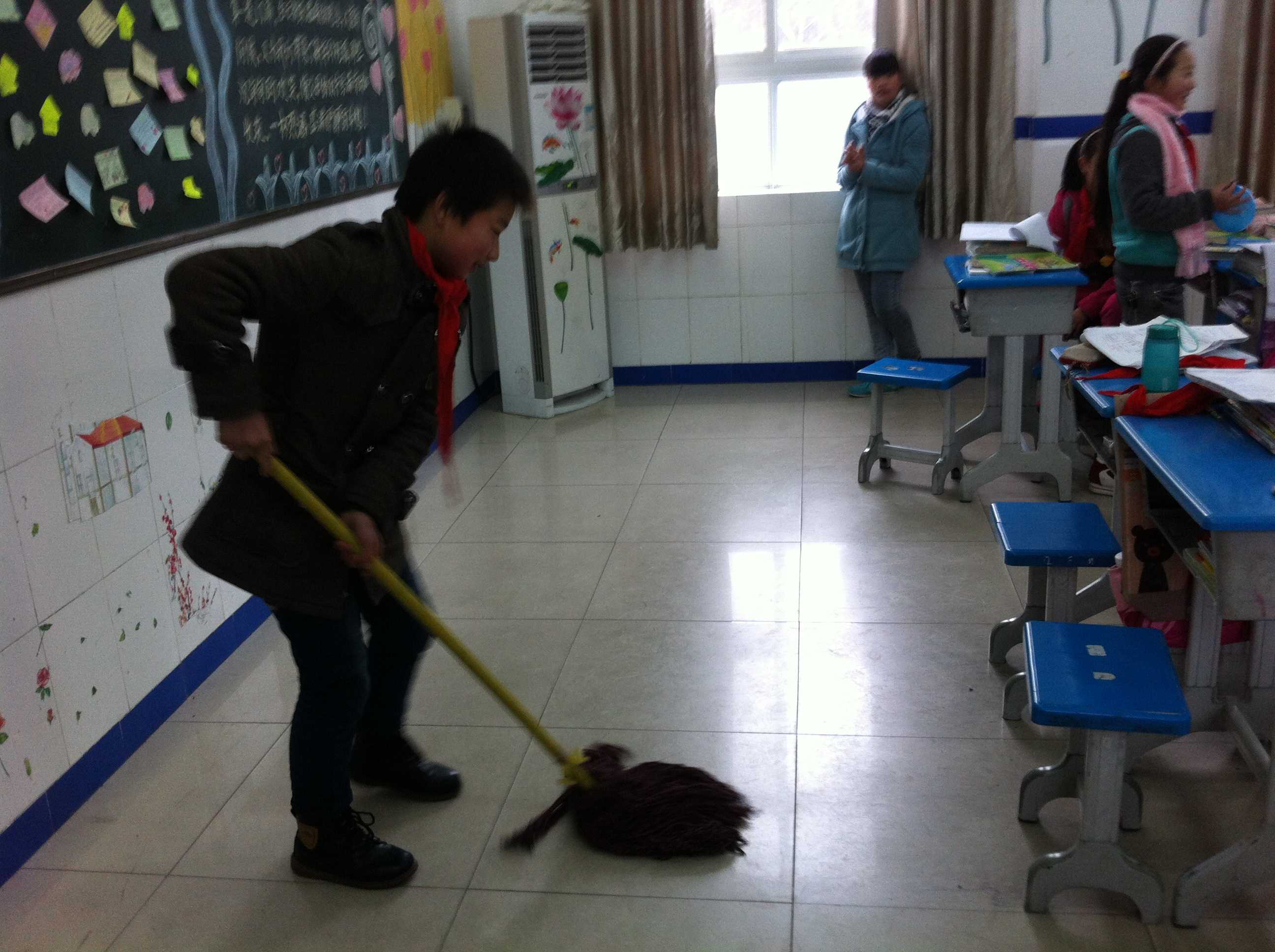 下课铃响了,老师刚走出教室,他就开始实行他的计划了。他把事先准备好的肥皂水洒在拖把上,然后假装拖地,最后她随便叫一个同学过来给他讲题。结果那位同学摔倒在过道上,他却在一旁哈哈大笑。那位同学只好无奈地看着他,摇了摇头。你说他调皮吗?