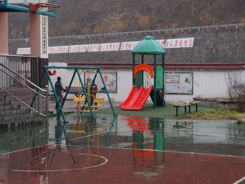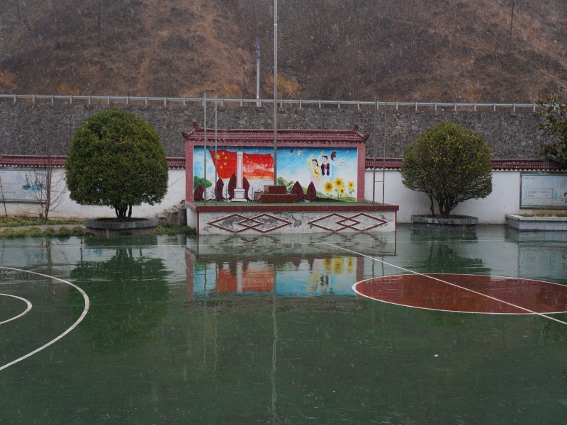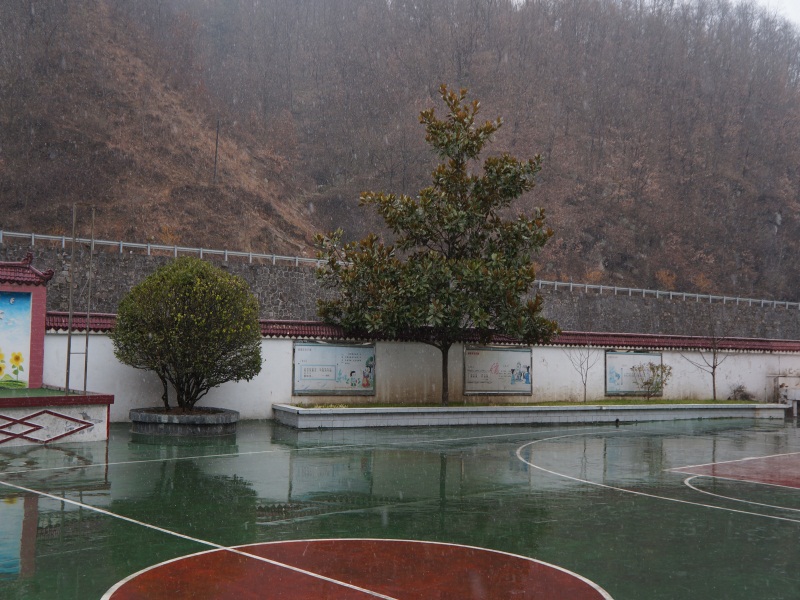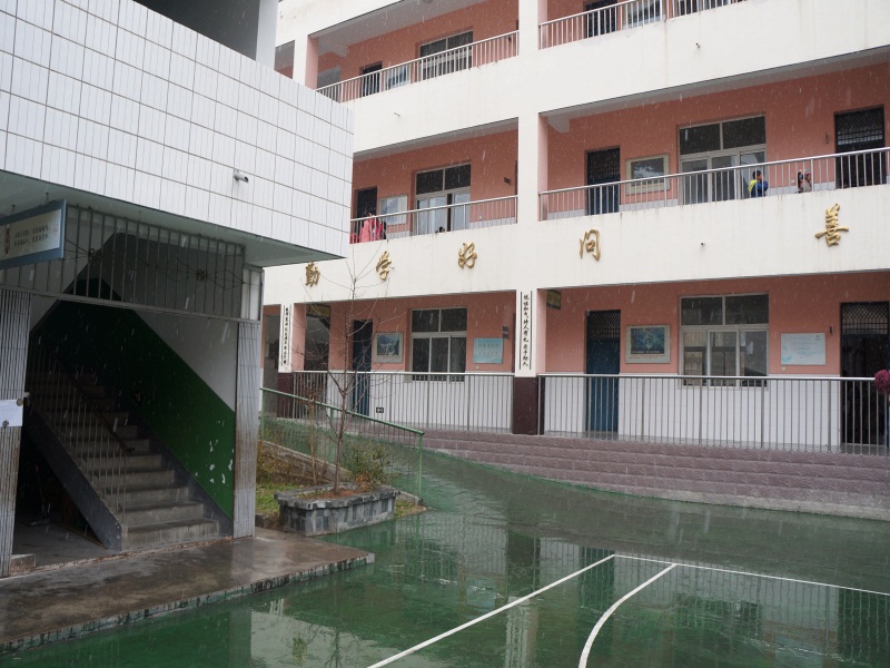 再将视野迁到南边,一条清澈的河床将校园围绕。两层高的数学楼屹立在国旗后,站在楼上俯视全校,就像一个对称的蝴蝶。两边各有一个花坛,灌木丛中的指甲花,红绿相间美极了,只不过入了秋,只是一片枯草。两边有两个乒乓球台,打眼望去就像个俊俏的脸蛋。