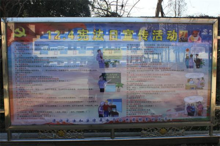 同时,学校结合"12.4宪法日"活动,广泛进行宣传,设立固定宣传栏宣传宪法知识和社会主义核心价值观,把安全、与德育、法治诸方面紧密结合在一起,确保教育到位,意识到位,行动到位。